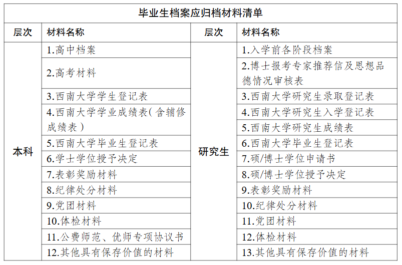 毕业生档案包括入学前档案材料和在校期间形成的档案材料。在校期间形成的档案材料分散在本科生院(招生办公室)、研究生院、党委学生工作部 学生工作处 武装部和校医院等多个部门,请各培养单位按照相关部门规定时间和程序领取应归档材料,并以学生个人为单位整理,将材料装入对应的毕业生档案袋,确保档案材料不遗漏、不错装。