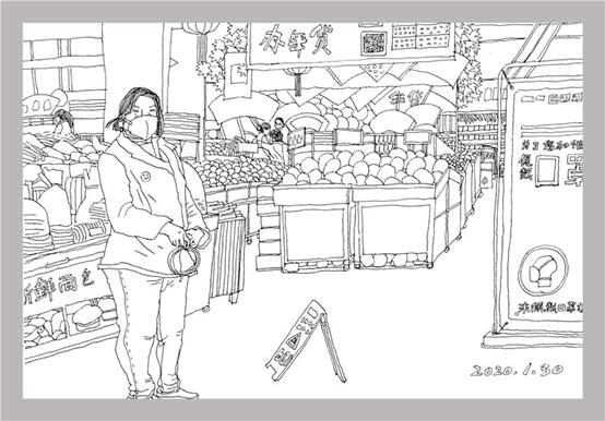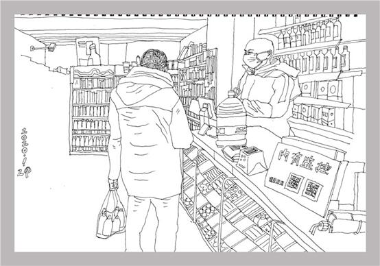 《小区门口便利店》:平时都是低头不见抬头见的街坊邻居,现在虽然戴了口罩、保持距离,但心意却是相通的。