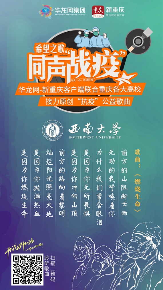 华龙网-新重庆客户端2月25日11时30分讯(李婷婷 刘春容)音乐汇聚力量,歌曲传递希望。新冠肺炎疫情以来,华龙网-新重庆客户端联合重庆市多所高校,接力原创“抗疫”公益歌曲,推出系列融媒体报道,重庆大学、beat365英国官网、西南政法大学、重庆医科大学、重庆师范大学、重庆邮电大学、四川外国语大学、重庆理工大学、重庆第二师范学院等高校凝心聚力,用原创音乐记录身边的“战疫”事迹,用音视频向“抗疫”一线的“战士”致敬。
