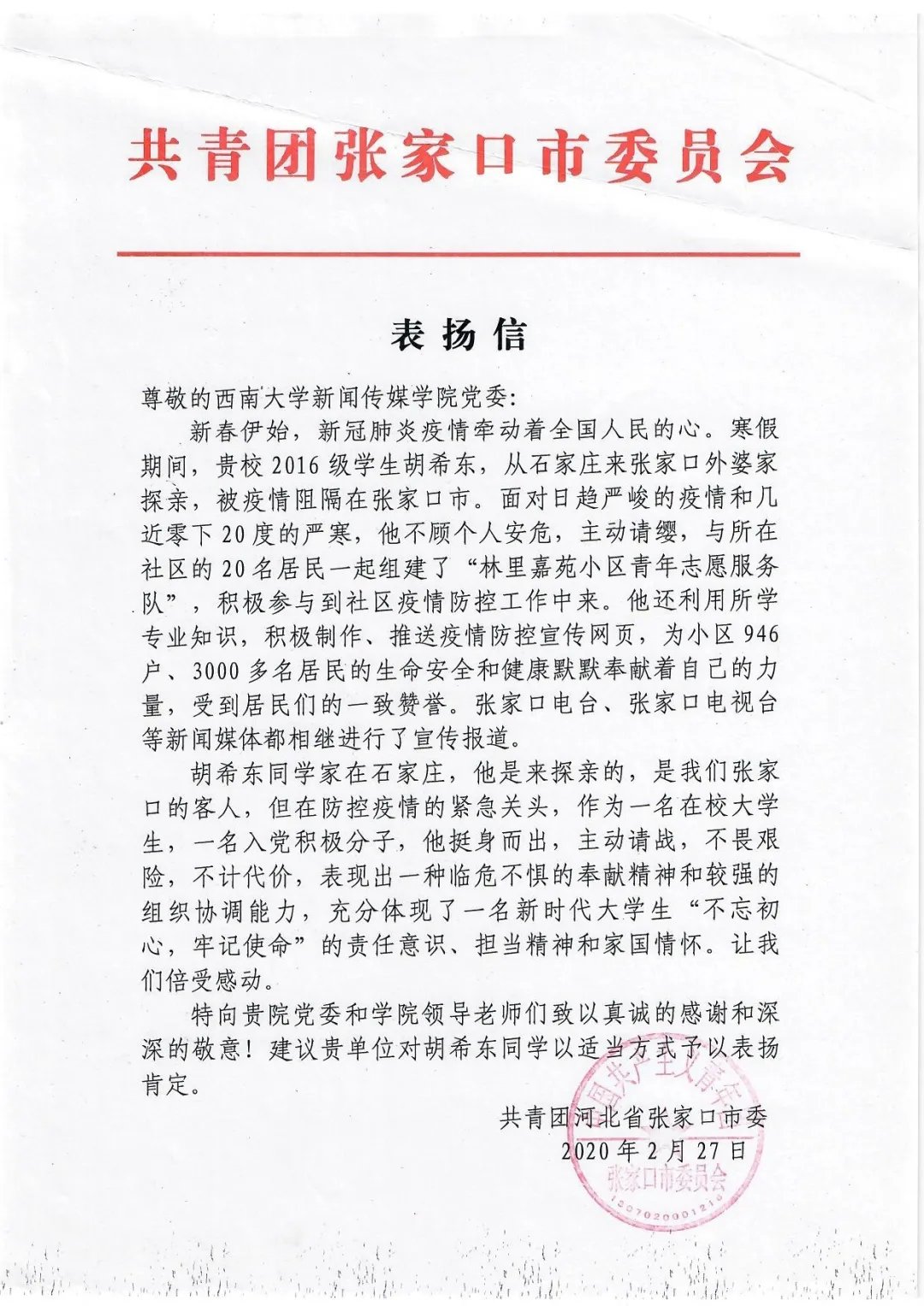 beat365英国官网新闻传媒学院2016级本科生胡希东参与组建了张家口市第一支由居民自发组建的志愿者服务队。在该志愿服务队的带领下,张家口市其他小区也积极行动起来,陆续组建起自己小区的居民志愿服务队,广泛凝聚了张家口市社区防疫工作力量。对此,河北省张家口市委专门寄来了表扬信。