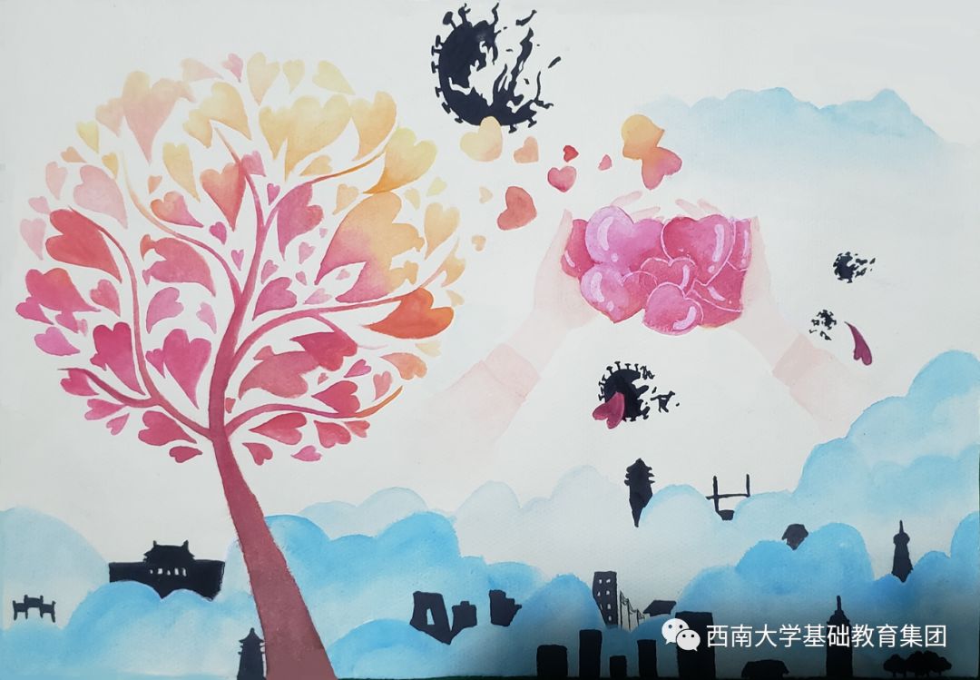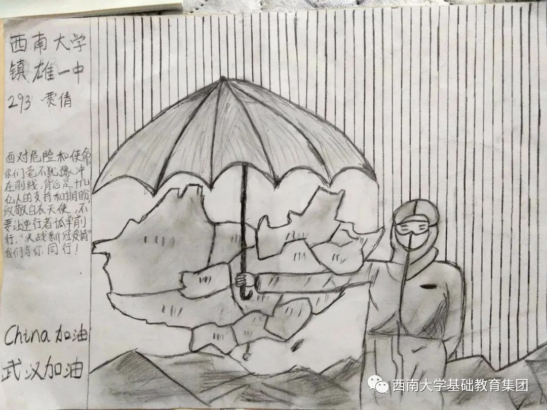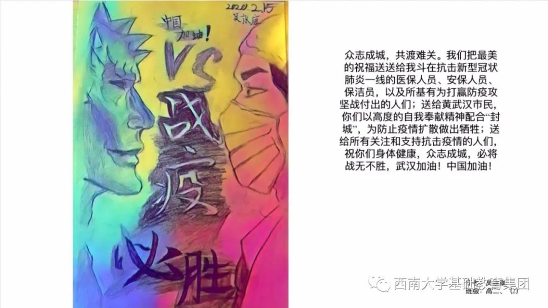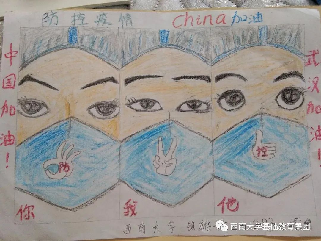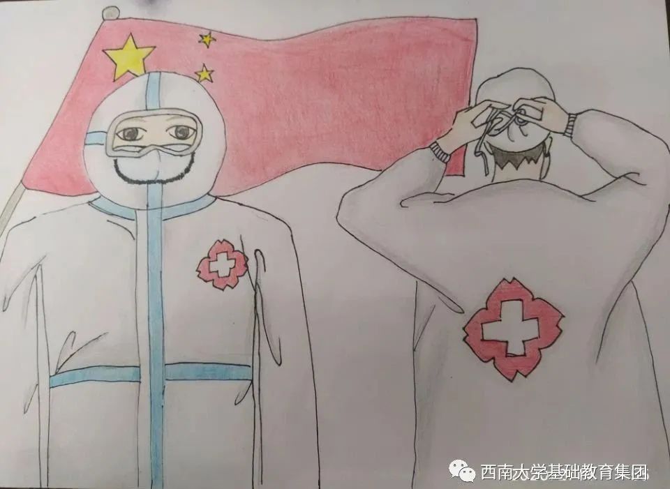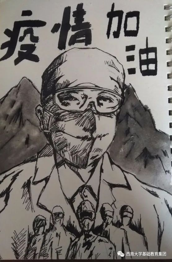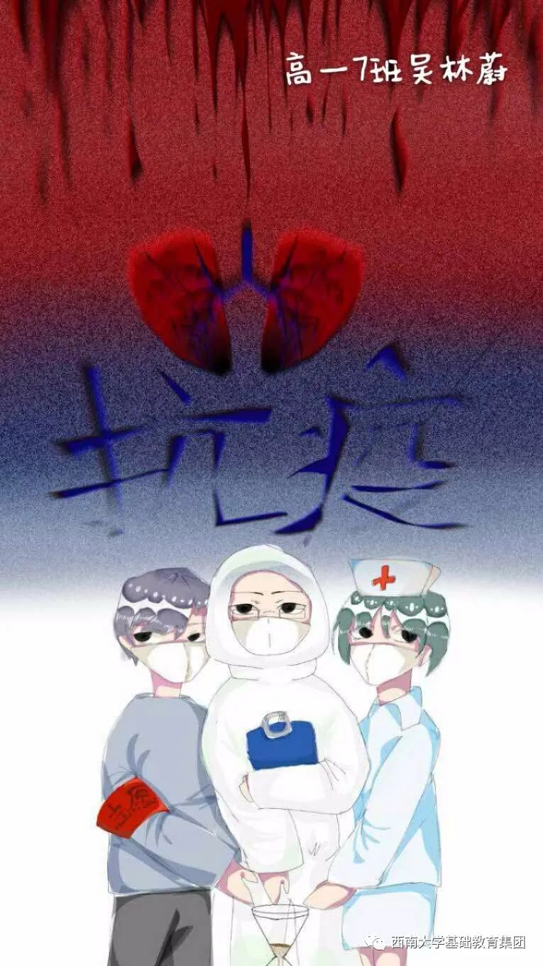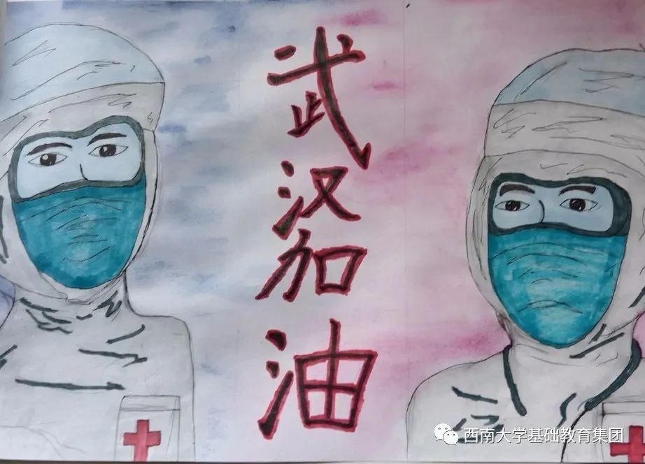 虽然不能像医务人员那样前往一线去救死扶伤,但是作为学生的我,有义务,也有责任为此次抗击疫情尽自己的微薄之力,为此我绘画了一副有关抗击疫情的绘画作品,想呼吁大家,在疫情面前人人有责,同时让人们意识到这次疫情的严重性,这场疫情不仅是国家之战,也是全民之战。一方有难,八方支援。中国人民齐心协力抗击疫情,我相信美好的明天就在不远处向我们招手。”