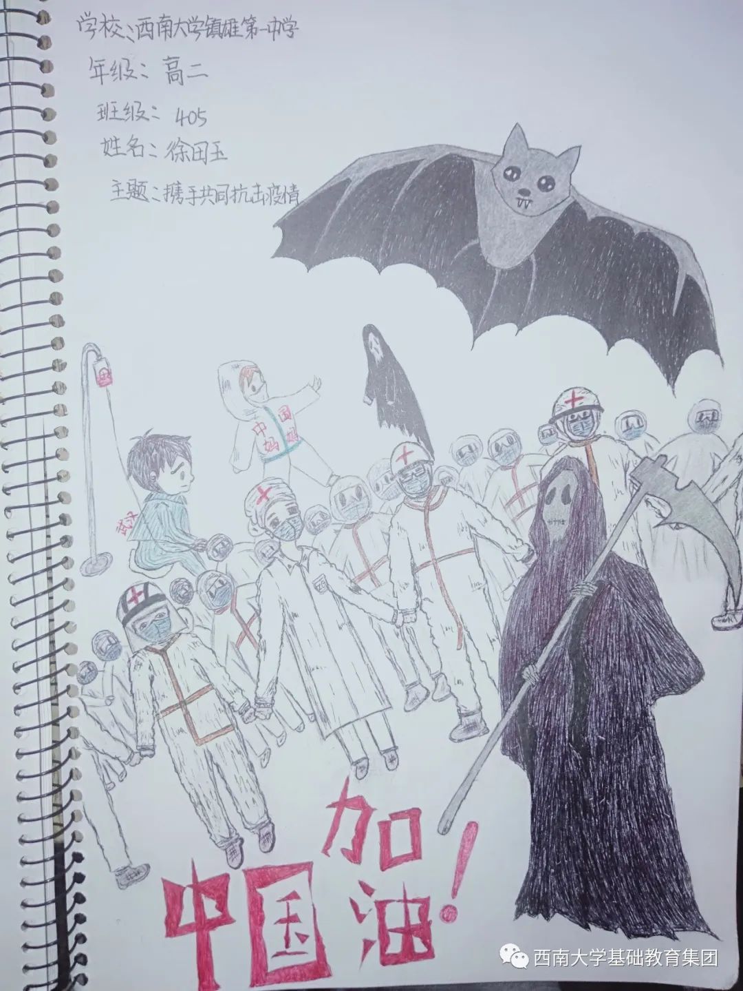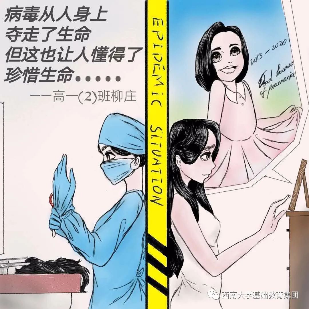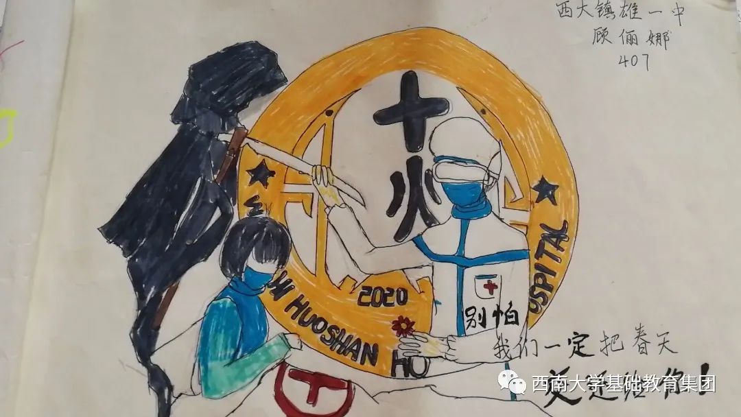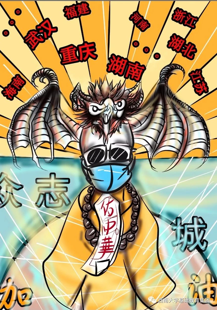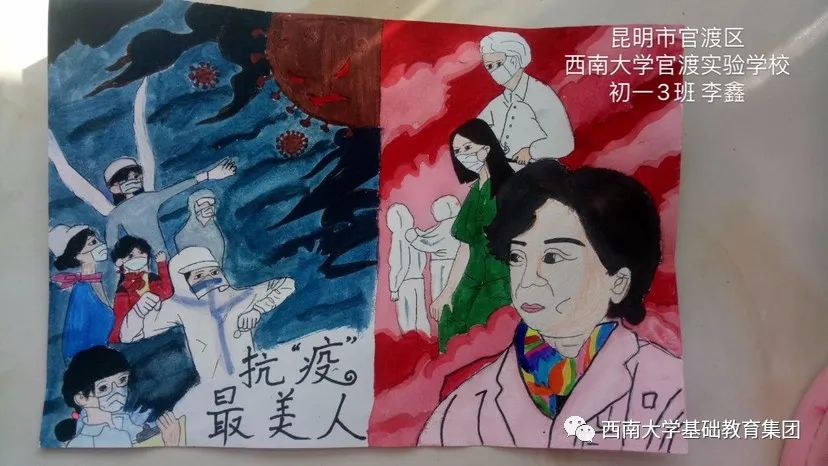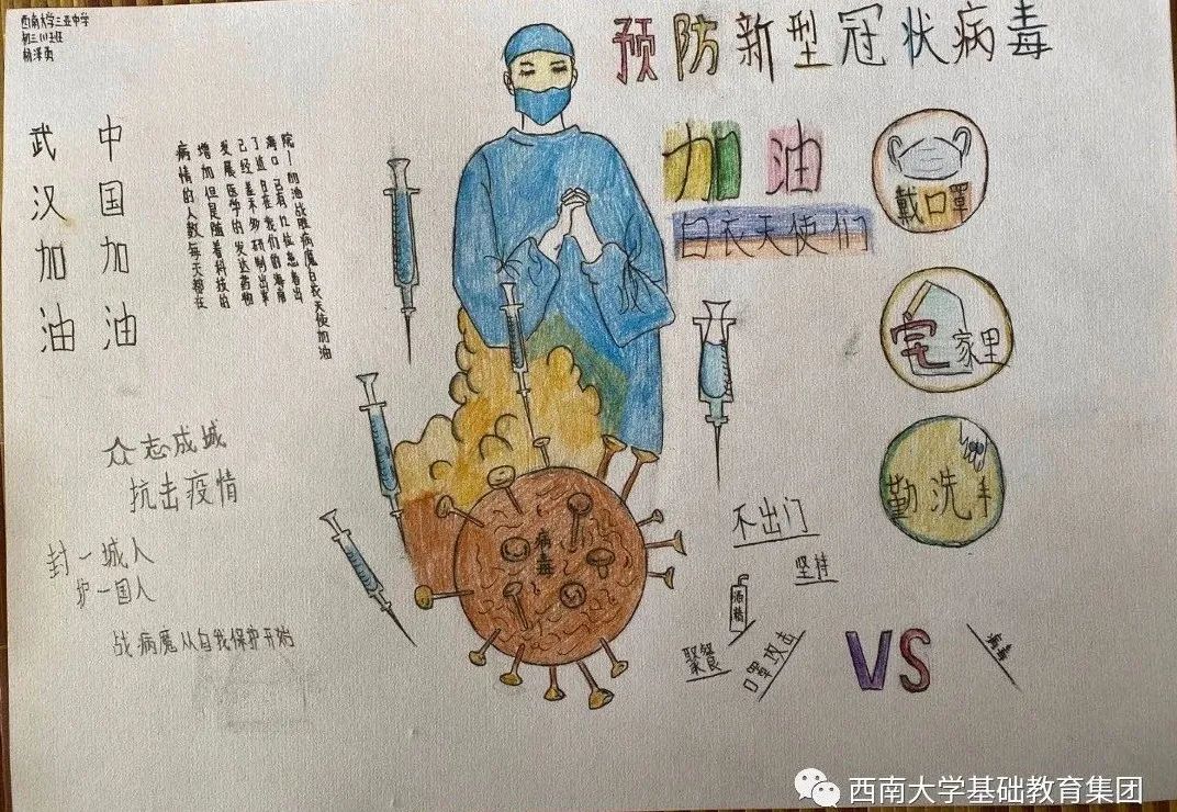 虽然不能像医务人员那样前往一线去救死扶伤,但是作为学生的我,有义务,也有责任为此次抗击疫情尽自己的微薄之力,为此我绘画了一副有关抗击疫情的绘画作品,想呼吁大家,在疫情面前人人有责,同时让人们意识到这次疫情的严重性,这场疫情不仅是国家之战,也是全民之战。一方有难,八方支援。中国人民齐心协力抗击疫情,我相信美好的明天就在不远处向我们招手。”