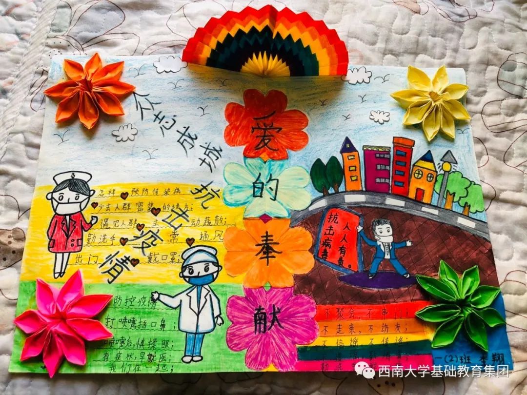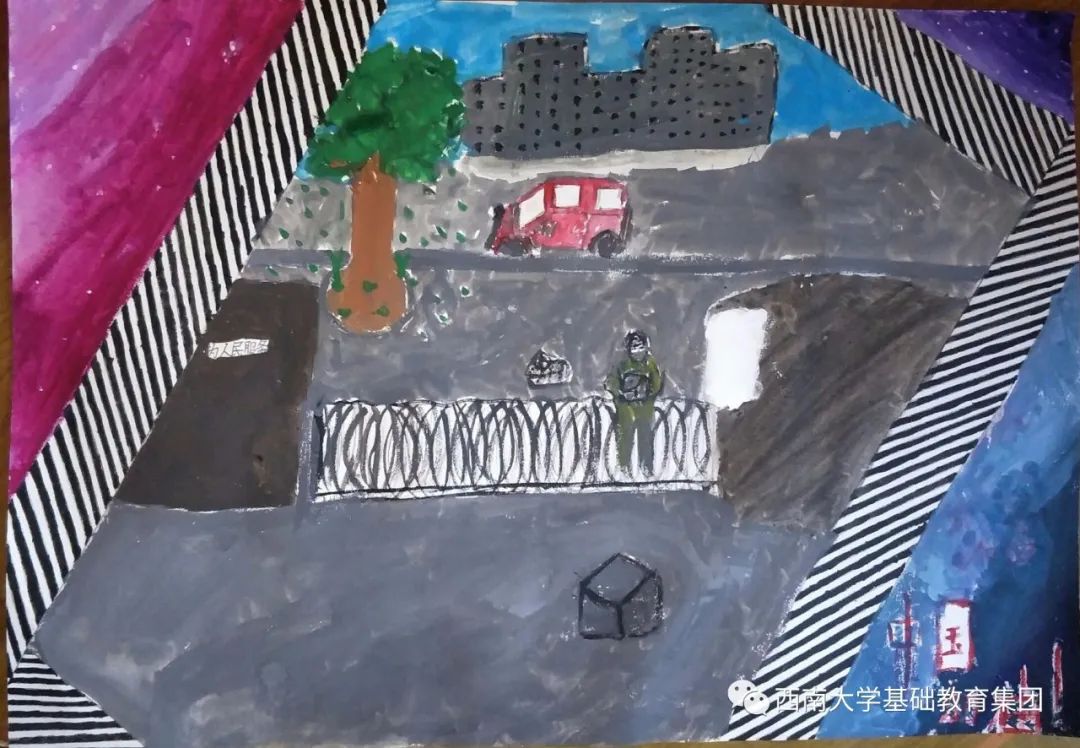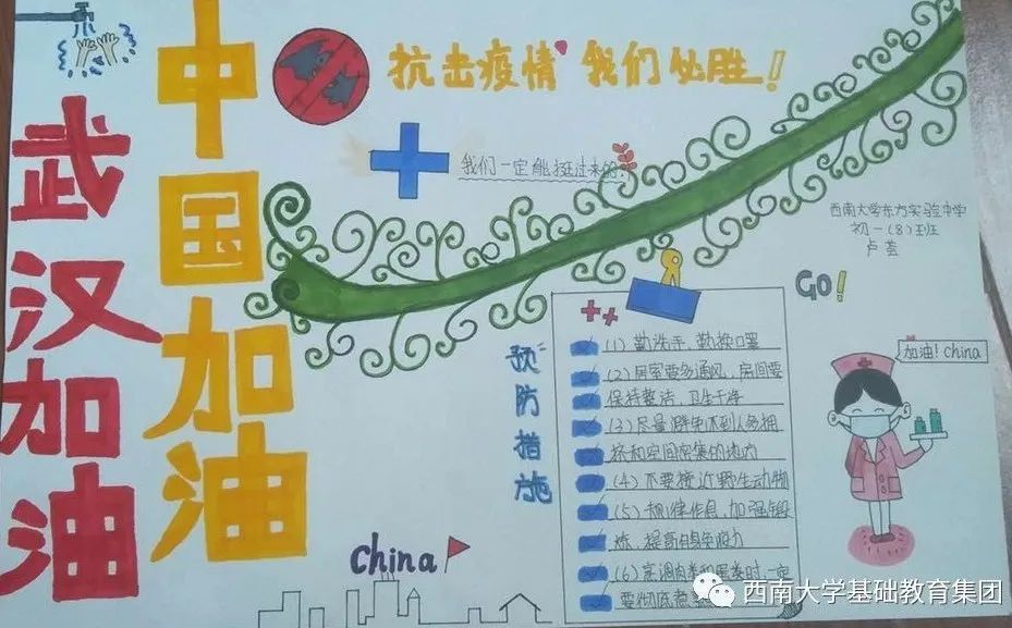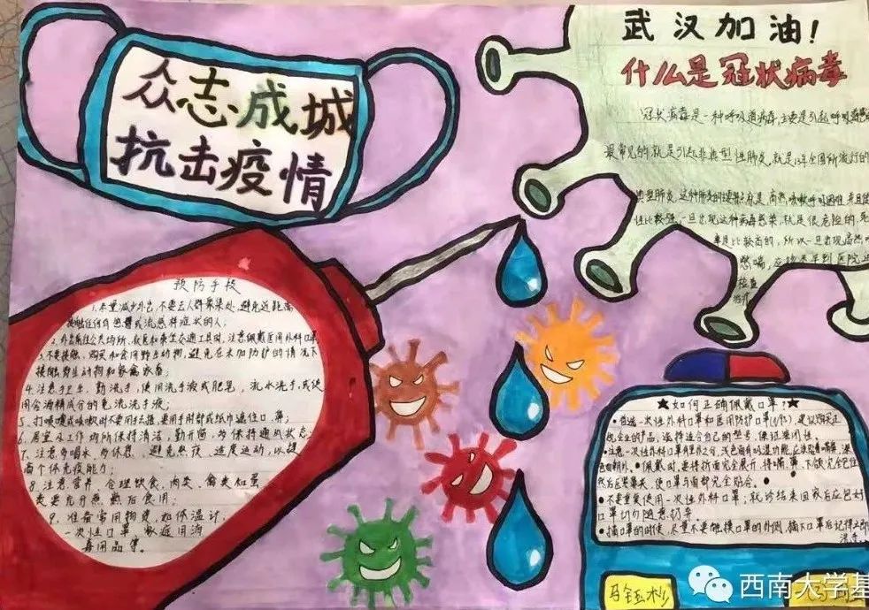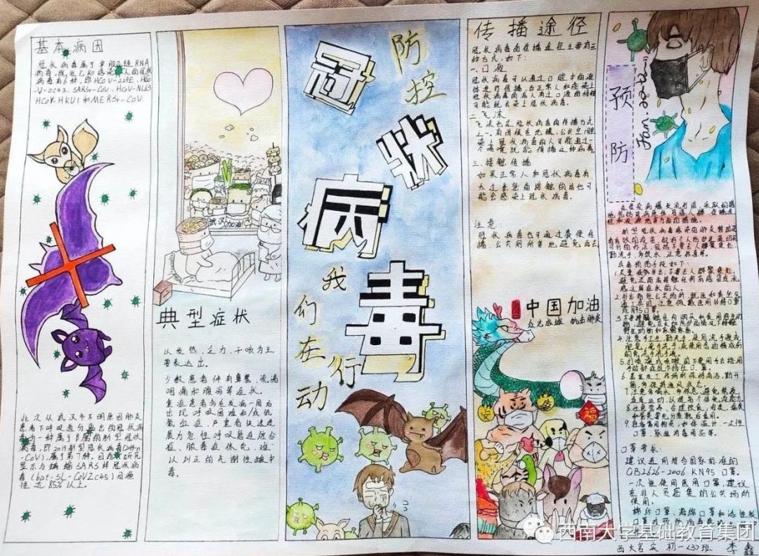●作品介绍:细心的朋友会发现,李同学的这幅作品是用手绘和拼贴的技法来呈现的,增强了单一媒介不能获得的对比与鲜艳程度,画面形式感特别强烈。作品同样写出了防疫口诀及防控疫情的方法。