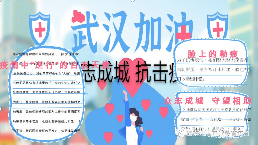 ●作品介绍:该作品是高同学用Word文档制作的电子手抄报作品,画面用色柔和,给人一种温暖的感受,主要记录了白衣天使们齐心协力,不怕牺牲,做抗疫的逆行者。”一方有难,八方支援“是中华民族的传统美德。