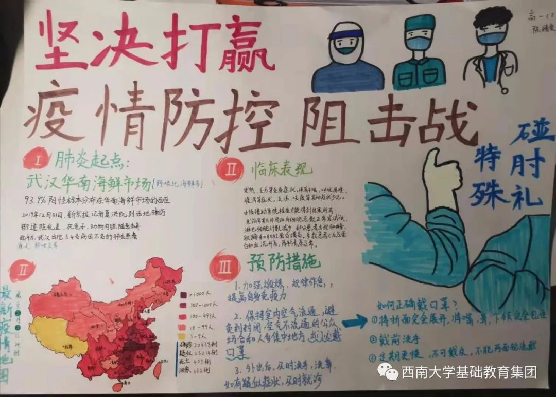 ●作品介绍:作者的美术刻画能力还不错,左下侧的中国地图画的比较准确,同时说明作者比较关注疫情防控的消息。作者从肺炎的起点(有待确定)—临床表现—预防措施,以及如何佩戴口罩等因素都阐述的很清楚。另外,”特殊碰肘礼“补充了防护措施,十分全面。