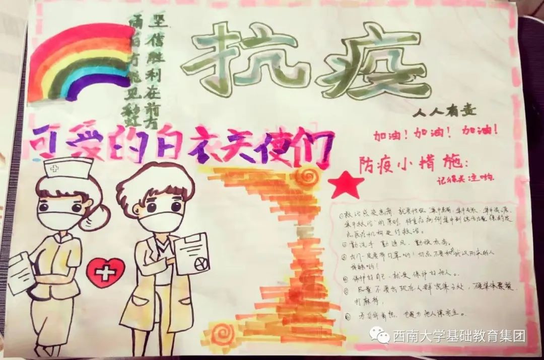 ●作品介绍:该手抄报作品展示了防疫小措施以及用自己的手段对可爱的白衣天使致以崇高的敬意。可爱的白衣天使们塑造的真的很可爱。