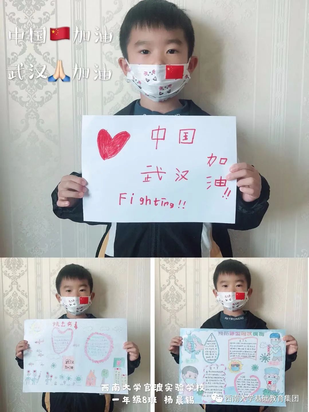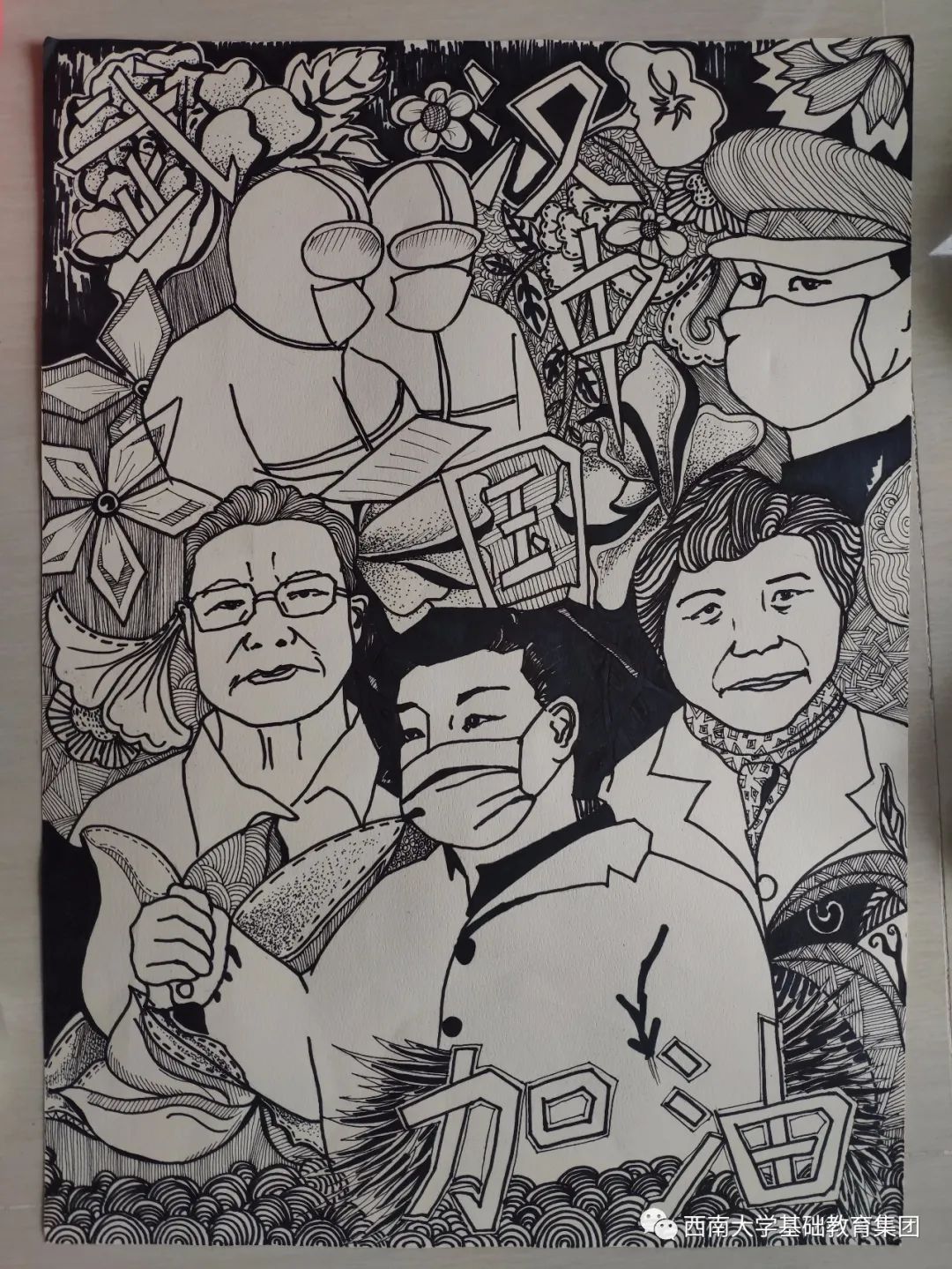 ●作品介绍:”中国加油,武汉加油“这句话深深的打动了观众,刚开始看觉得最上面这幅作品略显简单,后来发现在系列作品当中,第一幅作品显得如此的合群,打动老师们的还有口罩以及上面的国旗和图案,这是打动人心的系列作品。
