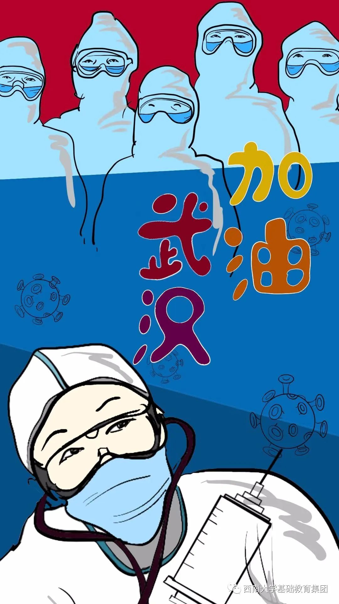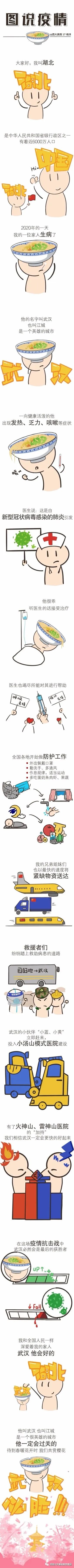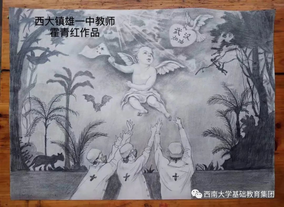 由于新型冠状病毒给武汉及全国各族人民带来了一系列影响和伤害,迫使人们关门闭户,惶恐难安。武汉各医院人满为患,医生、护士、警察、军人,科研专家等纷纷前往武汉救援,一批批物资运行通畅,如此震撼场面催人落泪,倍感安慰!此画传达的是一种积极向上的精神,画的中央是一个手握国旗的小天使,代表着武汉人民坚强勇敢,对祖国感恩自信的意念!下方托举小天使的是伟大的医护人员,他们任劳任怨,坚持一线和病毒作战,有他们在,武汉定会解除封印,自由飞翔。右上角的和平鸽嘴刁爱心,代表万物生灵来为武汉加油,为中国加油。小天使头顶的光芒指希望的曙光,希望武汉恢复生机,希望中国人民团结致志,共抗病魔,希望人类从此保护环境,爱惜动物,和动物和谐相处,让爱散发希望的光芒!