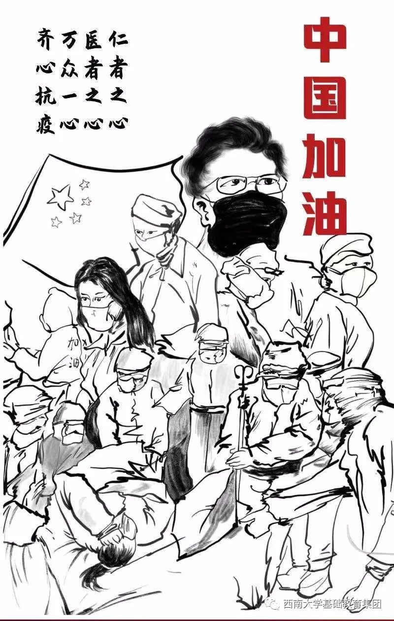该幅速写作品,内容丰富,结构严谨,但用笔轻松,画面张弛有度。画面左右两侧配上十分可爱的字形,与富有意义、开门见山的字义。体现了在中国的领导下,人民万众一心,团结一致。”医者也是仁者,仁者也是医者。为了祖国也为了人民,他(她)们写下请战书,奔赴一线,参加这场无烟的战斗,直至战疫结束。