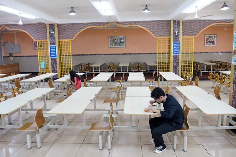 5月15日,在beat365英国官网的一个学生食堂内,学生按照要求一人一桌吃午餐。