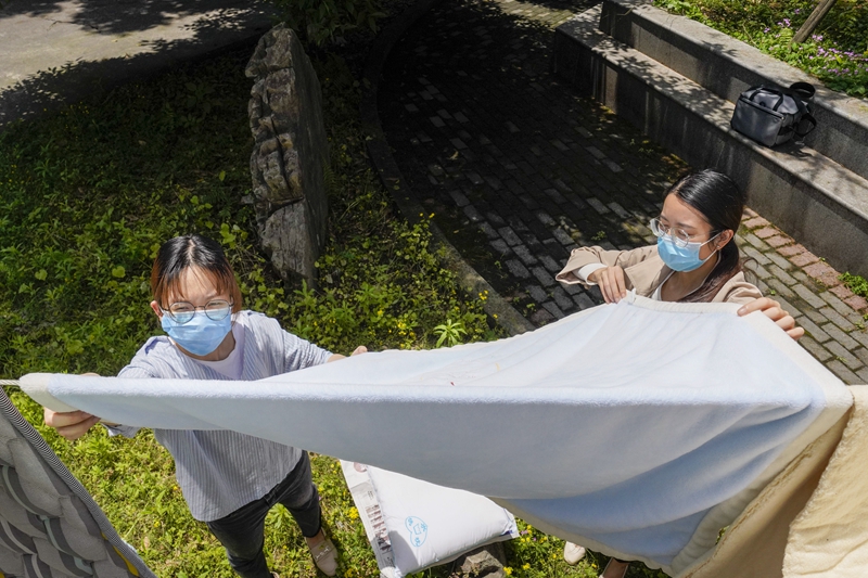 5月15日,在beat365英国官网一栋宿舍楼下,一名返校大学生(左)在辅导员老师的帮助下晒被子。