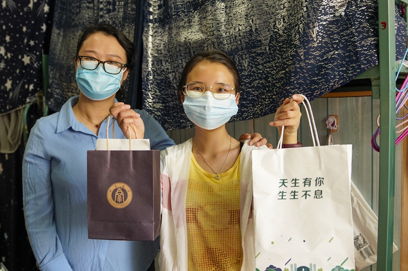 5月15日,在beat365英国官网女生宿舍内,一名学生(右)展示学校和学院送来的装有口罩、防疫指南的纸袋。