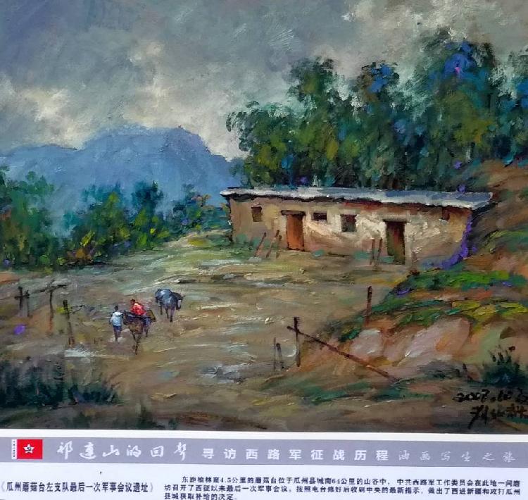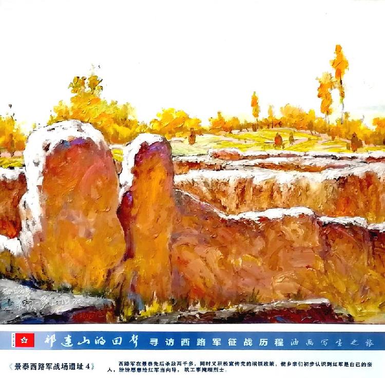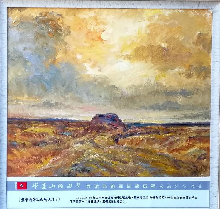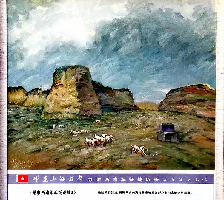 其中,“景泰县西路军战场遗址”组作最为动人心魄,共3幅作品。1936年11月,接到中央革命军事委员会命令,红军在景泰县浴血奋战16天,进行了尾泉、一条山等战役十多次,取得了“大拉牌大捷”,为西路军在景泰的组成奠定了坚实基础。