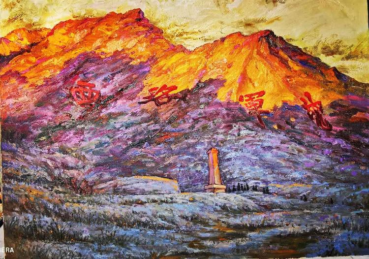 《西路军最后一次回忆》是画展中色彩非常鲜艳的一幅,描绘的是在夕阳余晖中金色的西路军营,彰显中国工农红军西路军的辉煌和英勇。