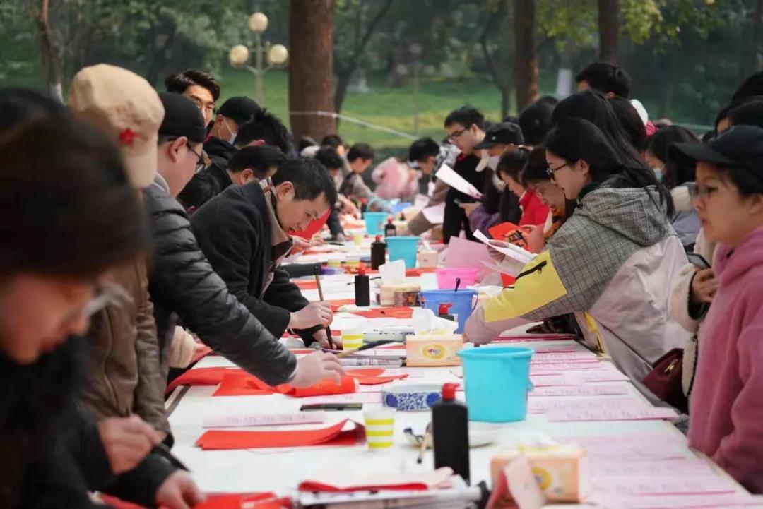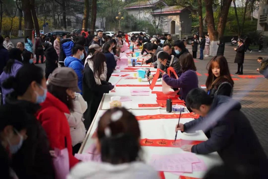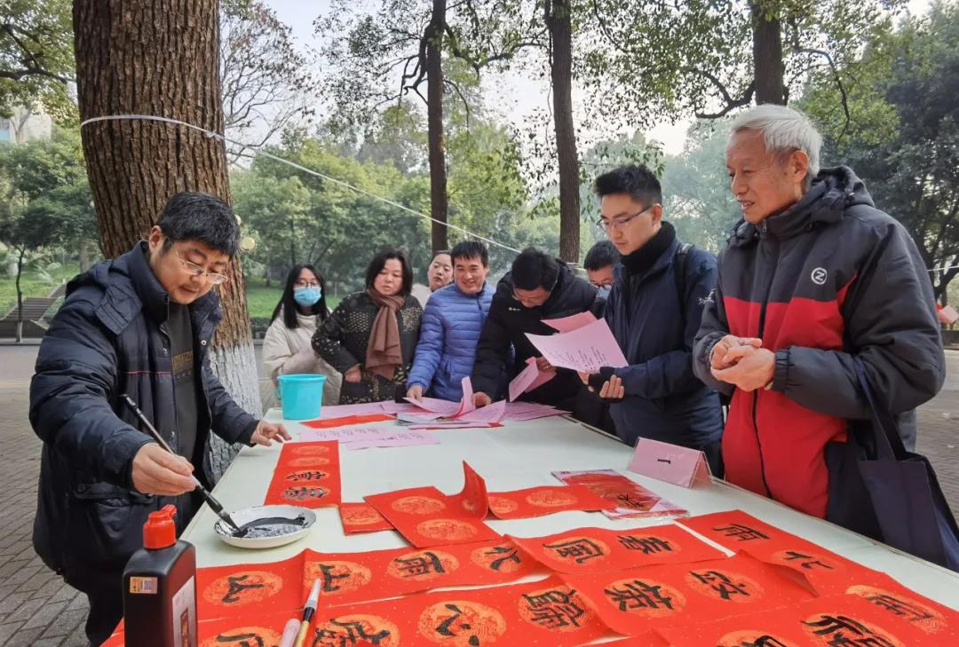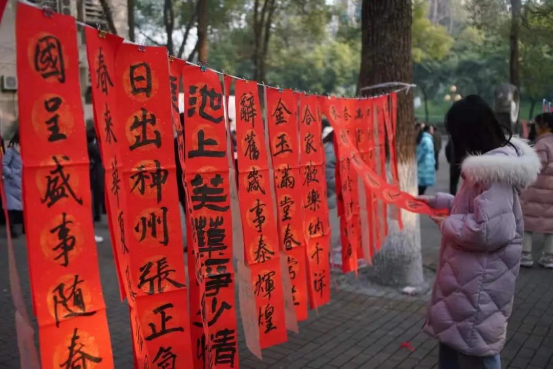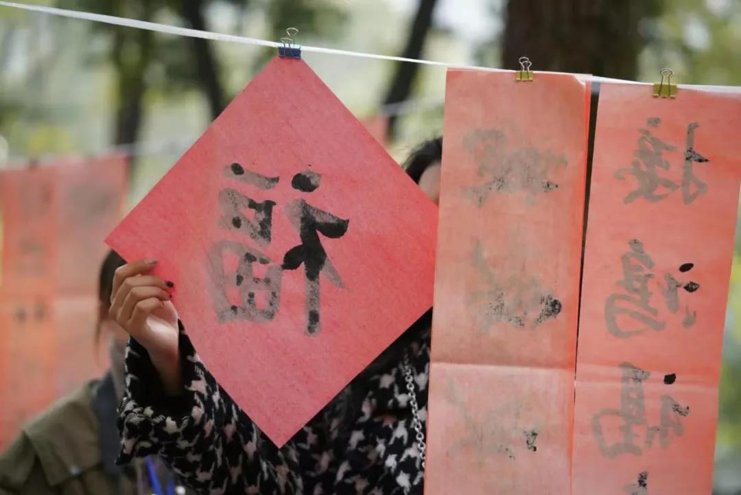 在学校樟树林广场,有美术学院的多名教授、研究生正在在大红春联纸上进行创作。据了解,今日全校共有20名师生参与创作对联,共计千余副。许多领取到春联的学生都表示,十分的欣喜,“不仅是艺术品,也是来自新年的祝福。”学生们纷纷表示。