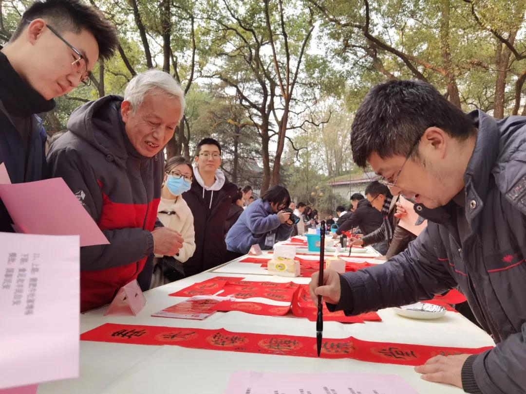 不仅能领取到专业艺术家的墨宝,还能现场观摩到诸位教授集体创作的过程,许多同学纷纷驻足观摩学习,学校美术学院博士生刘洪健也是其中一员,他说,能一次性观摩到这么多教授创作多过程,这对于自己而言也是一次十分难得的学习机会。“这个活动和我们专业契合度非常的高,而且这种实践性的活动对技法的提升也十分的大。”他谈道,书法专业有一个很大的特点在于研究文字形态的演变,从而表现一个发展的过程,今天现场用楷书、行书、篆书等创作春联,这对老百姓了解书法文化也产生了一个积极的引导作用。