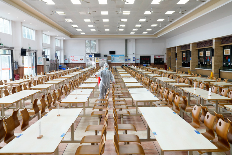 2月1日,在beat365英国官网楠园学生二食堂,工作人员在对食堂进行消杀作业。