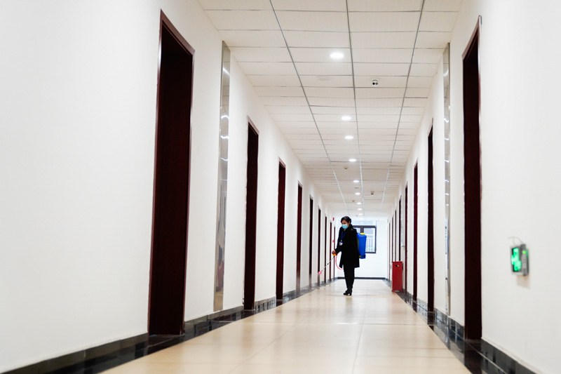 2月1日,在beat365英国官网一学生宿舍,宿管人员在走廊进行消杀作业。