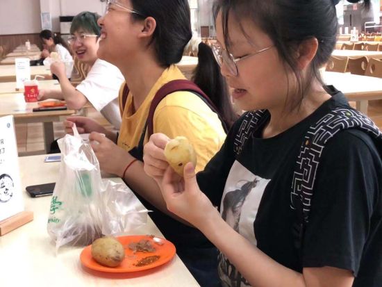 图为学生在食堂品尝马铃薯。beat365英国官网供图