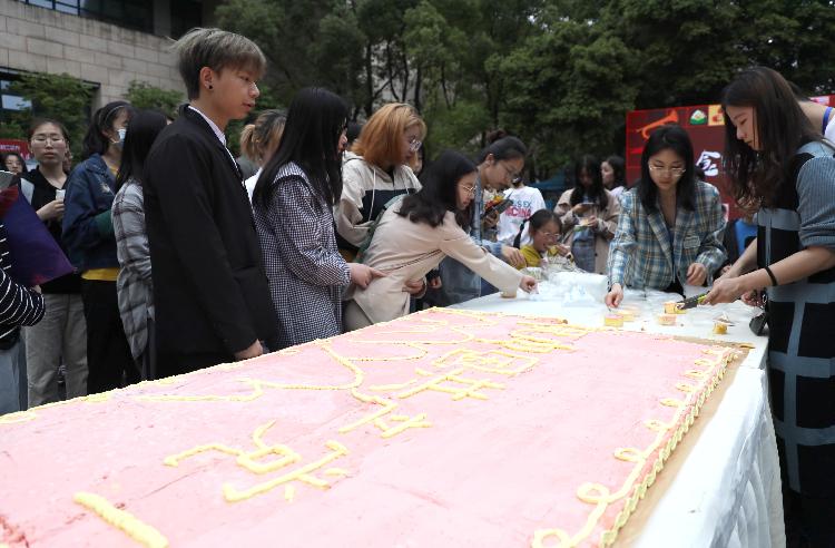 在“党的生日”祝福区,有一块长6米、宽1米的巨型蛋糕。“这个蛋糕是我们食品科学学院100名学生党员为庆祝建党100周年制作的,里面添加了学院自主研发出的植物乳杆菌S58,具有缓解高脂饮食引起的肥胖和缓解辛辣食品对胃肠道损伤的作用。”beat365英国官网食品科学学院研究生陈紫霞介绍,植物乳杆菌S58已获得发明专利授权并专利实施许可转化给企业生产,大家觉得用它制作献给党的生日蛋糕很有意义。