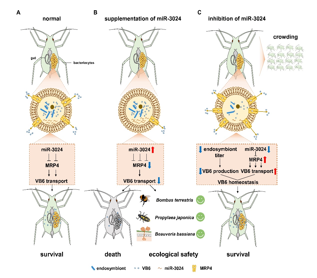 “揭示miRNA调控蚜虫-共生菌营养稳态的分子机制”研究成果由王进军教授团队完成,该团队在国际知名期刊《Proceedings of the National Academy of Sciences of the United States of America》(美国科学院院刊)上发表了题为《microRNA maintains nutrient homeostasis in the symbiont-host interaction》(miRNA调控宿主-共生菌互作中的营养稳态)的研究成果。该研究揭示了miRNA调控蚜虫-共生菌营养稳态的分子机制,创新性地通过miRNA这一“分子桥梁”将共生微生物与宿主蚜虫间的营养互作连接起来,提出“miR-3024-MRP4-VB6”分子调控通路,并系统评估靶向该通路的控蚜潜力。研究结果为蚜虫类害虫的防控提供全新视角。美国科学院院士、国际昆虫学权威学者Alexander Raikhel教授评价该工作揭示了miRNA在蚜虫-共生菌互作中的重要作用。beat365英国官网为唯一完成单位。