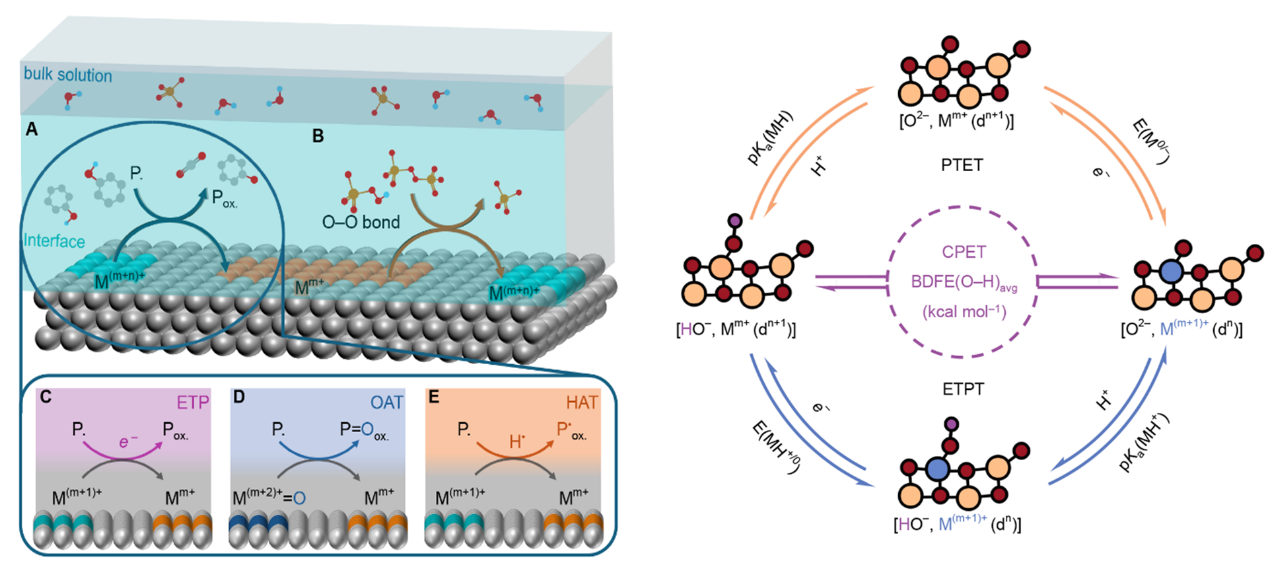 分散式水处理技术因其在成本和节能方面优于传统的集中式系统而日益受到重视。基于过氧化物的分散式高级氧化工艺虽具潜力,但其反应机制长期被认为由单一电子转移驱动。该研究通过原位定量实验与热力学分析,揭示了在典型过渡金属氧化物催化的过氧化物活化过程中,质子与电子以1:1的严格比例耦合转移,形成高活性金属(氧)中间体,显著提升污染物氧化效率。这一发现突破了传统认知,首次从实验和热力学角度证实了质子-电子耦合转移在固-液界面的核心作用。