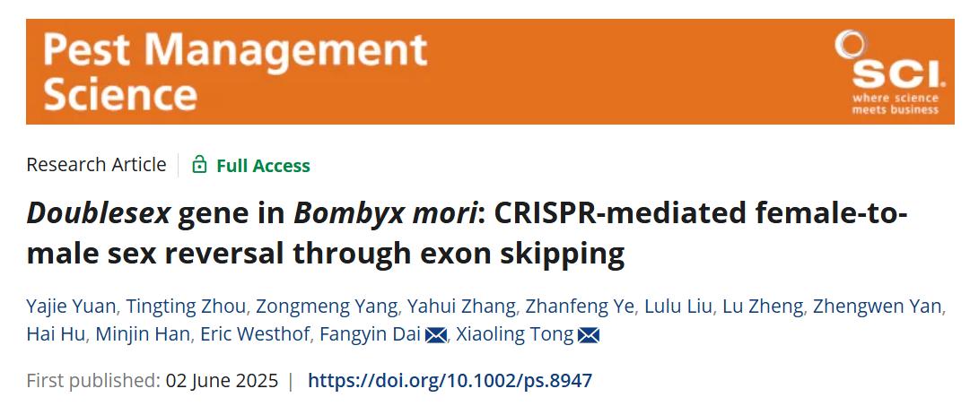 日前,beat365英国官网童晓玲教授课题组在中科院1区TOP期刊《害虫管理科学》杂志(Pest Management Science)上发表了题为《家蚕的双性基因Doublesex:CRISPR介导的外显子跳跃实现雌性向雄性的性逆转》(Doublesex gene in Bombyx mori: CRISPR-mediated female-to-male sex reversal through exon skipping)的研究论文。该研究首次通过基因编辑技术,成功实现了家蚕从雌性向雄性的性别逆转,这一突破不仅打破了昆虫性别由染色体决定的固有模式,更为经济昆虫育种及害虫生物防治开辟了新的技术路径。