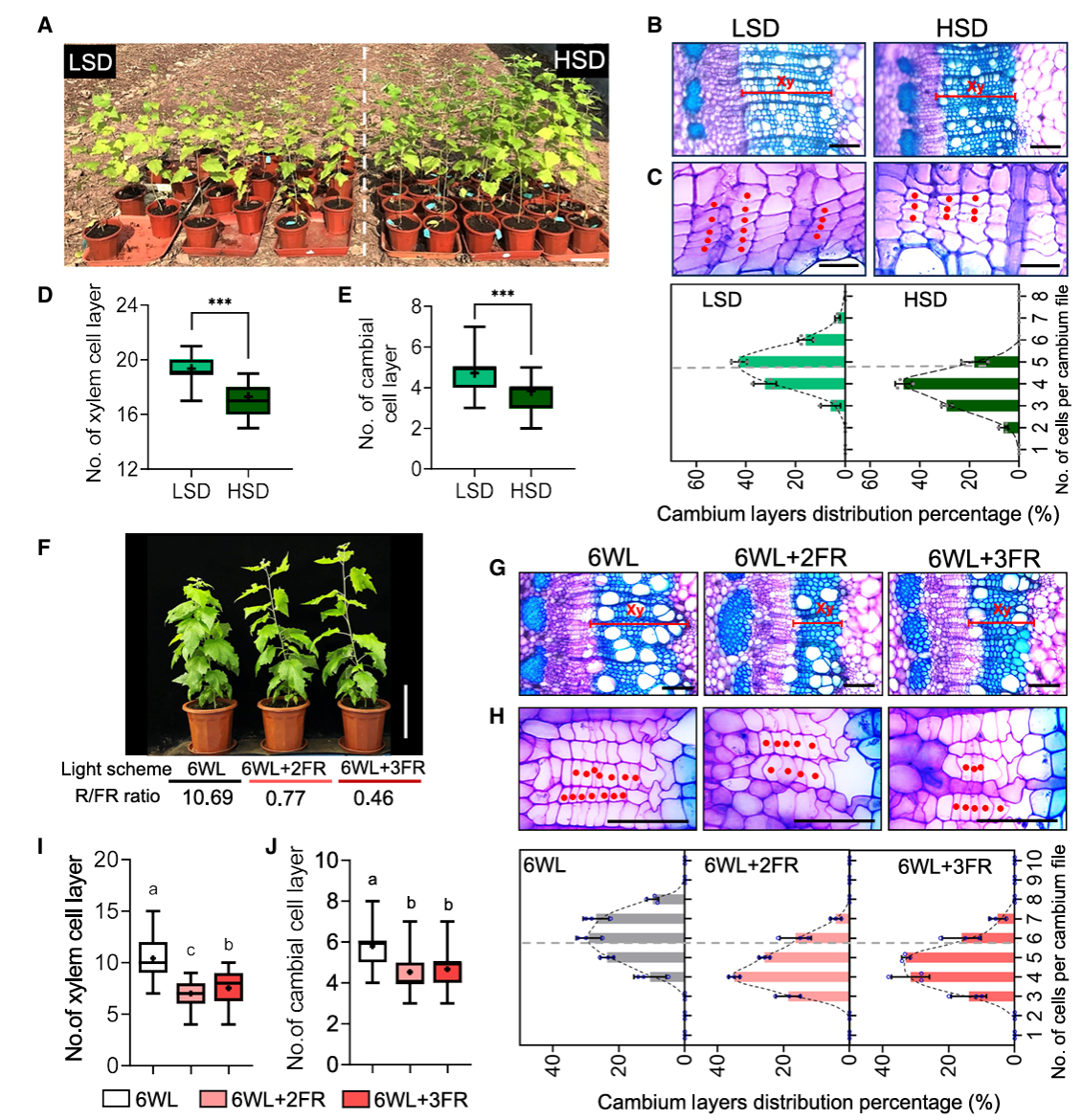 在森林生态系统中,无论是天然林还是人工林,林木密度过高导致的遮荫效应是制约木材产量的关键因素。当上层冠层叶片选择性吸收红光(R)并反射远红光(FR)时,下层植物感知的光环境R:FR比值显著降低,进而触发植物一系列避荫反应,最终抑制木材形成。因此,解析树木耐密的分子基础对提高森林生产力具有重要理论价值和实践意义。