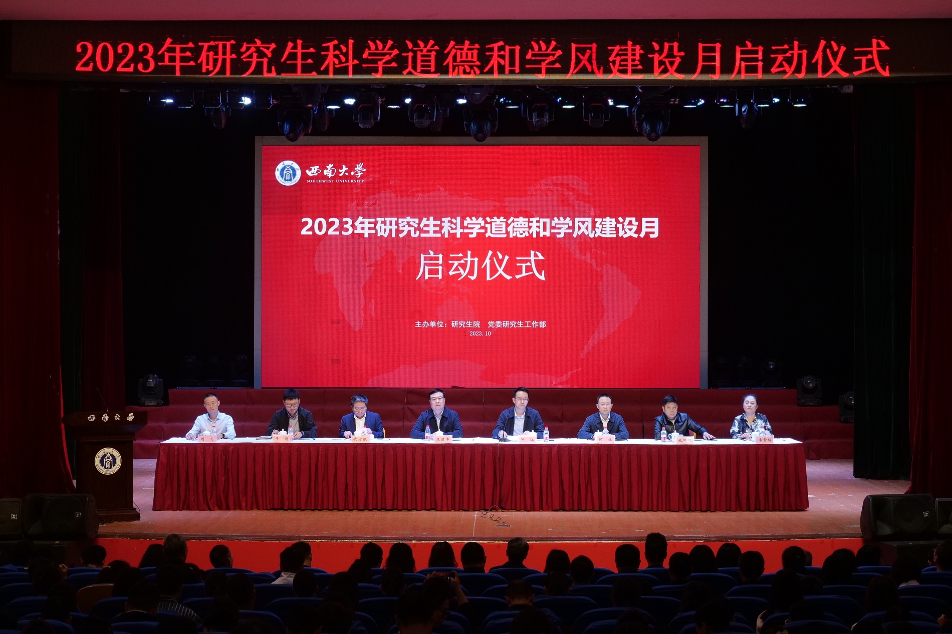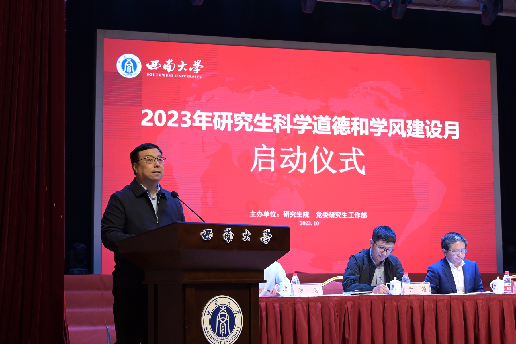 10月20日上午,学校在光大礼堂举办2023年研究生科学道德和学风建设月启动仪式。副校长王进军,研究生院院长邱江,学校各相关职能部门负责人,导师代表、各二级培养单位分管研究生思政工作负责人、辅导员和研究生代表参会。会议由邱江主持。