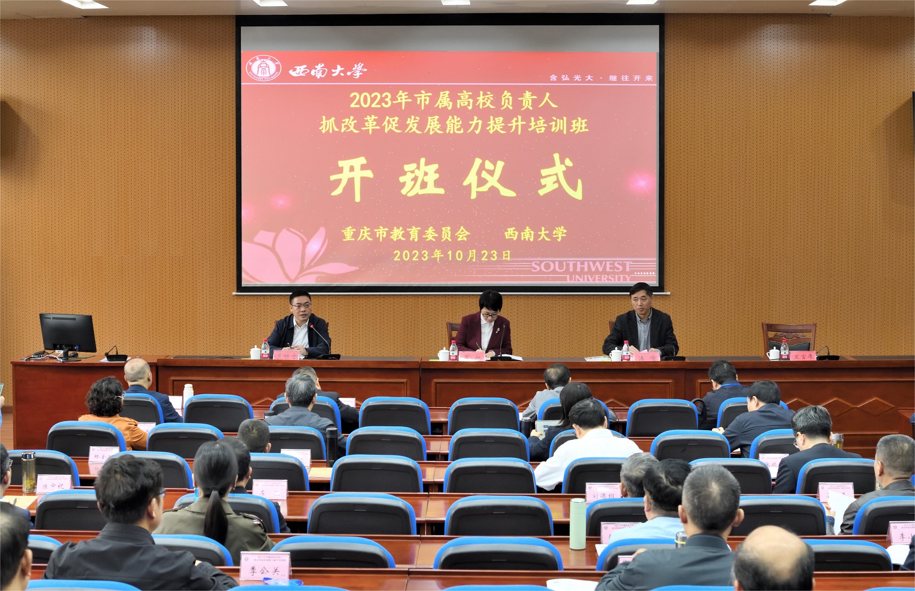 10月23日上午,重庆市属高校负责人抓改革促发展能力提升培训班在学校开班。市委教育工委专职副书记屈锐、beat365英国官网党委副书记潘洵出席开班仪式,开班仪式由市委教育工作领导小组秘书组秘书处处长罗胜奇主持。