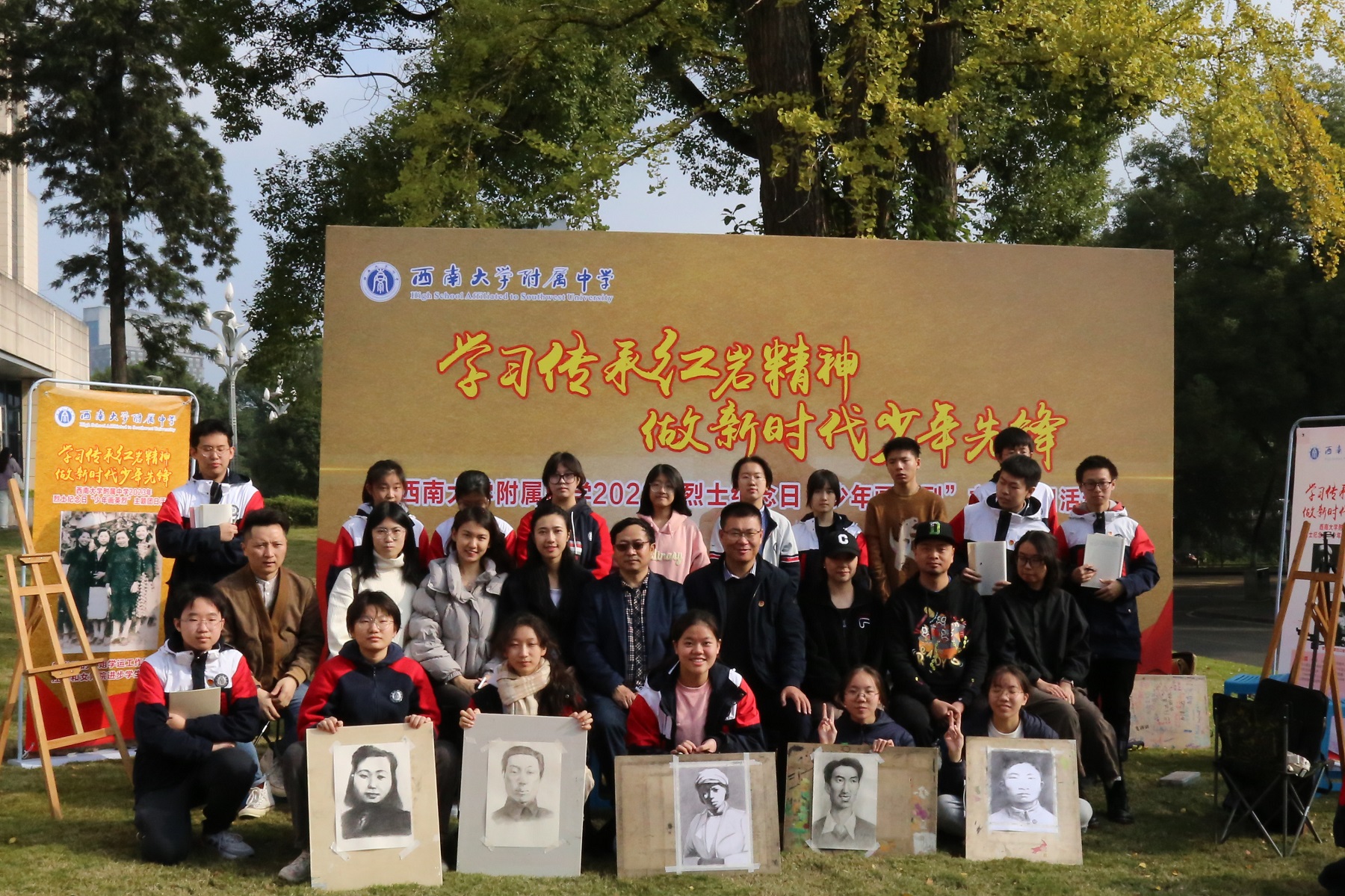 校史馆前的草坪上,郑劲松老师给同学们上了一堂生动的思政教育实践课,学生们聆听着著名英烈江姐当年联系国立女子师范学院的事迹,赞叹着陈诗伯、张泽浩等红岩烈士的革命英雄主义精神,学英雄,画英雄,追念英雄,致敬英雄。美创班的学生们架好画板,拿出画笔,满怀敬畏之心,临摹先烈肖像。学生会成员写下自己参加此次活动的感悟。孩子们的笔触满怀深情,“下笔春蚕食叶声”,一笔一划激起了我们灵魂深处的一次次感动。