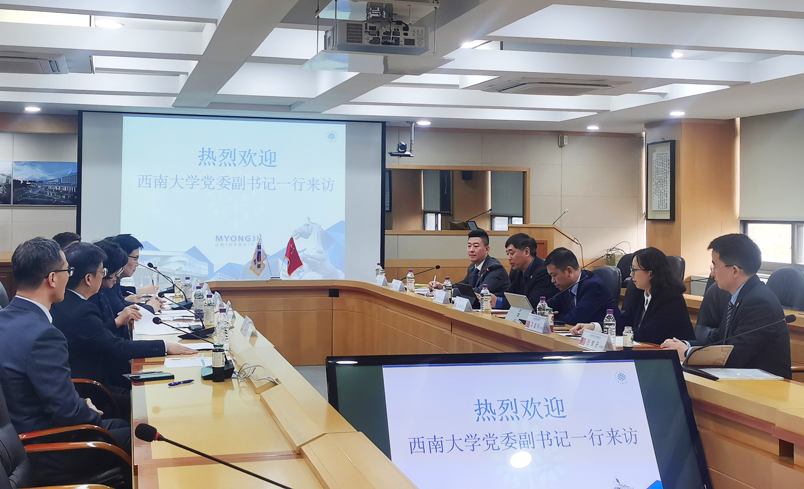 在明知大学,代表团受到副校长宣正源一行热情的接待。宣正源指出,两校建立校际合作时间虽不长,但很有合作诚意,起点很高。潘洵表示,两校有许多相近相通的优势学科专业,尤其希望未来在艺术与体育学科方面进行师生之间的长、短期交流,培养兼具国际化视野的创新型人才。