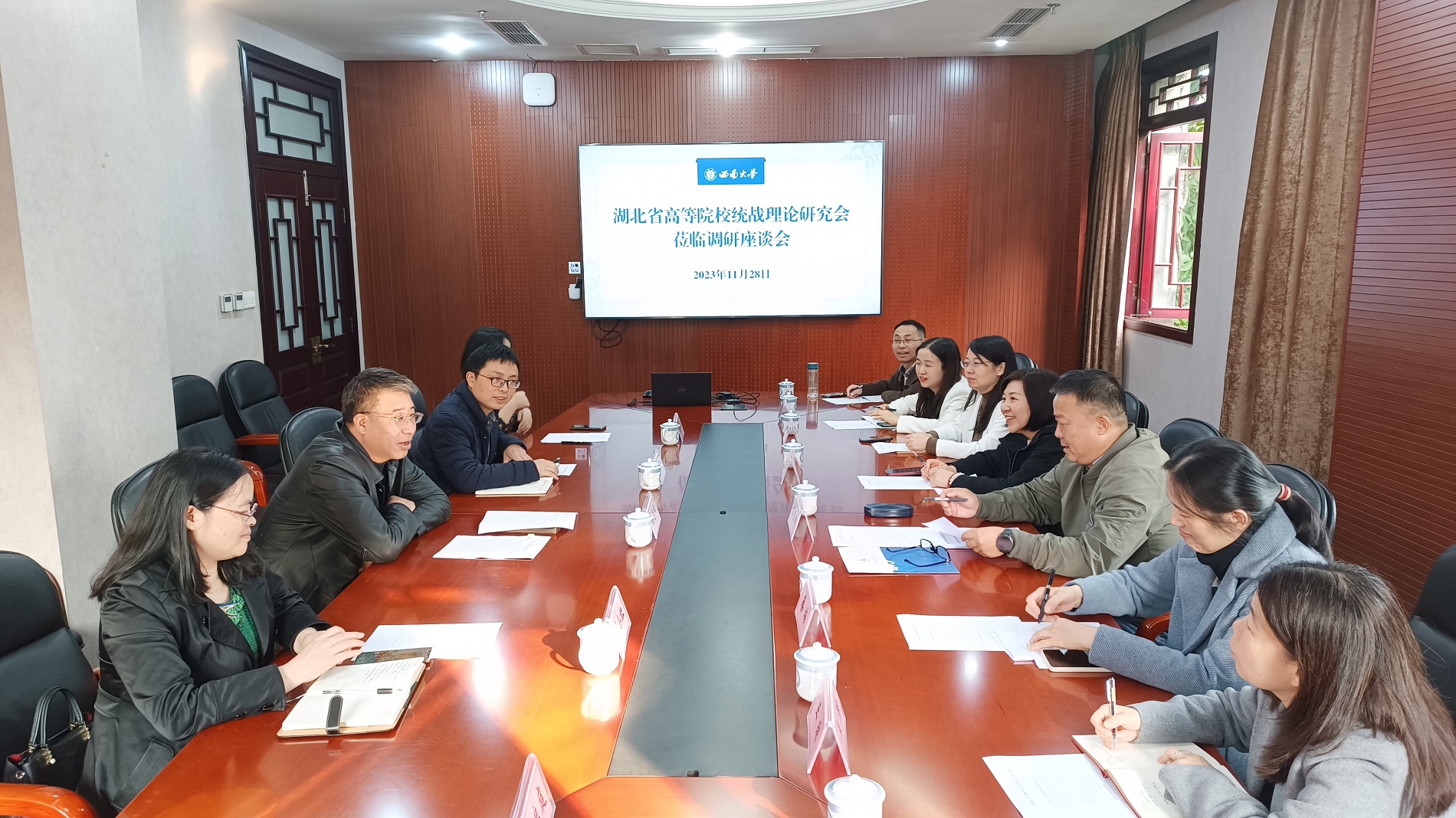 11月28日下午,湖北省高等院校统战理论研究会来校调研高校党外代表人士队伍建设。学校党委统战部全体工作人员参加调研座谈。