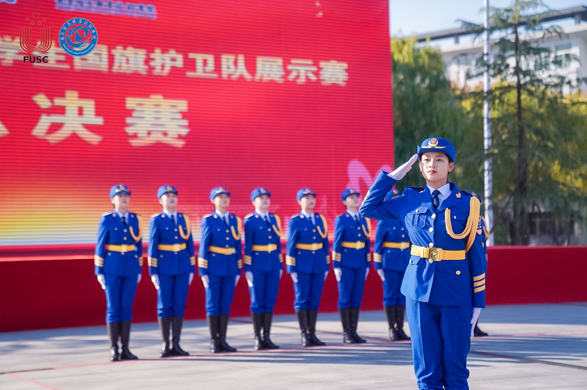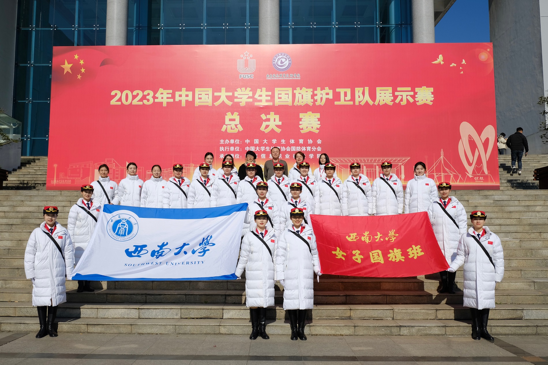11月30日至12月4日,中国大学生国旗护卫队展示赛总决赛在江苏省南京市举行。本次比赛由中国大学生体育协会主办、中国大学生体育协会国防体育分会执行、南京信息职业技术学院承办,分为甲组(普通组)、乙组(高职高专组)、丙组(高水平组)三个组别,包括升旗展示和队列动作两项比赛。经过激烈比拼,学校学生女子国旗班最终获得甲组升旗展示第一名、队列动作第五名、团体总分第二名的佳绩。