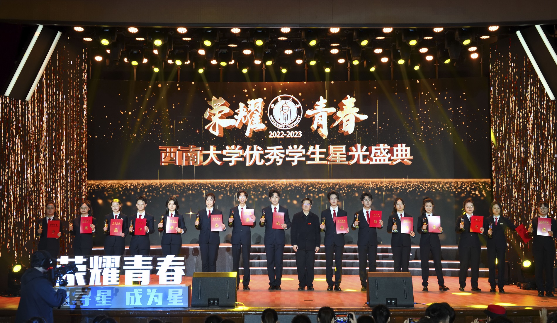 青春因奋斗而出彩,青春因荣耀而闪亮。为激发全校学生学习先进、争当先进、赶超先进的热情,营造优良校风学风,全面彰显“新学工”育人格局,用典礼定格beat365好青年的青春群像,12月17日晚,学校“荣耀青春”2022-2023学年优秀学生星光盛典在光大礼堂举行。学校全体在校校领导出席活动并为受表彰学生颁奖。学校学生工作领导小组成员单位负责人,教学单位党政负责人,辅导员、班主任代表,校友代表,学生代表等800余人参加活动。
