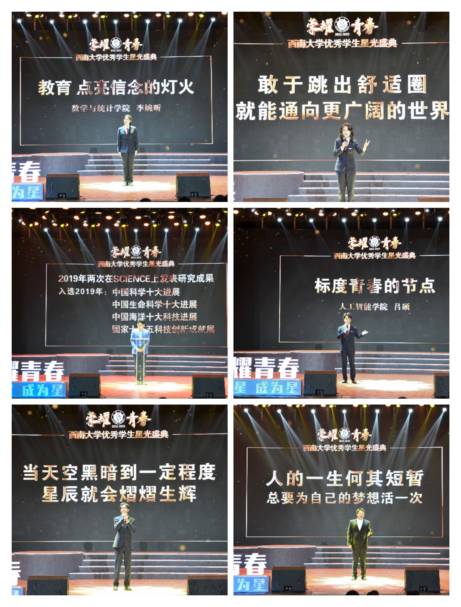 优秀学生标兵、研究生代表、校友代表分别带来主题讲述。数学与统计学院2020级本科生李婉昕以《教育,点亮信念的灯火》为题,表达了教师要“坚守三尺讲台这一方最美国土”的崇高信念。药学院 中医药学院2020级本科生蒋汪皓以《星光引路人》为题,讲述了药学学子冲破迷茫、困顿,终成星光引路人的奋斗历程。文学院2020级本科生吴婧卓以《破圈生长,让世界更浩大》为题,讲述了自己全面出圈、挑战自我的经历,发出了“让世界见证中国力量”的青春宣言。人工智能学院2020级本科生吕硕以《标度青春的节点》为题,阐释了自己以“努力”“坚持”“探索”为青春节点的“无标度网络”,呼吁青年学子拓宽边界、追求卓越。研究生代表、心理学部2021级博士生张号博以《转角遇到精彩》为题,讲述了自己的两次人生“转角”,证明了人生通过主动求索,在“转角”也会遇到精彩。园艺园林学院2006届优秀校友、第一届中国科学院青年五四奖章获得者、中国科学院植物研究所博士生导师王文达研究员以《让科学家精神与我们发生光合作用》为题,讲述了自己“从0到1”解析出第一个捕光蛋白结构的艰辛历程,鼓励学弟学妹们扎根科研土壤,为实现梦想而努力生长。文达校友的研究成果两次发表在《Science》期刊上,并入选2019年“中国科学十大进展”“中国生命科学十大进展”“中国海洋十大科技进展”和“国家十三五科技创新成就展”。校团委学生艺术团分别带来了主题曲《荣耀青春》、情景诗朗诵《青春是生生不息的火炬》和结束曲《向光而行》。