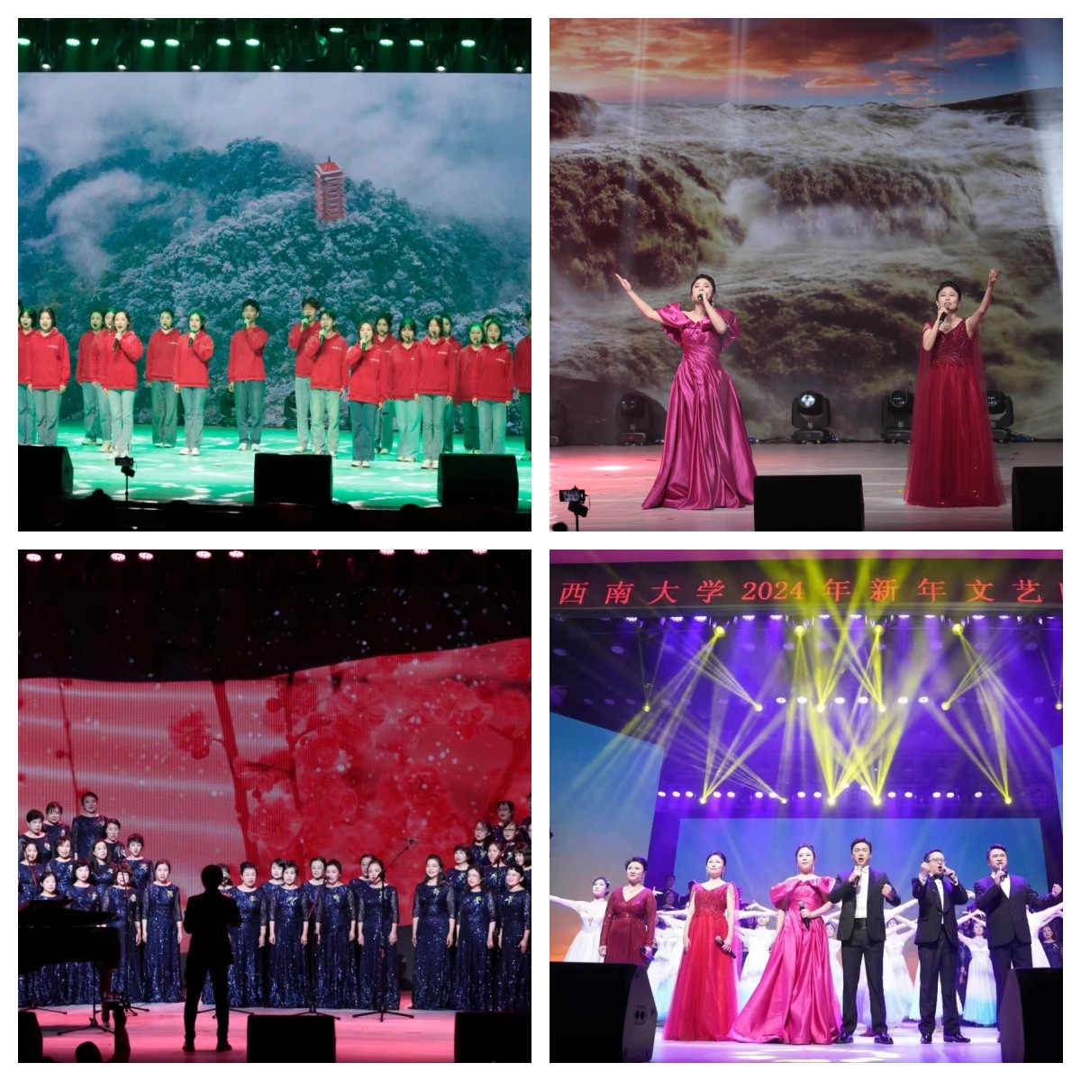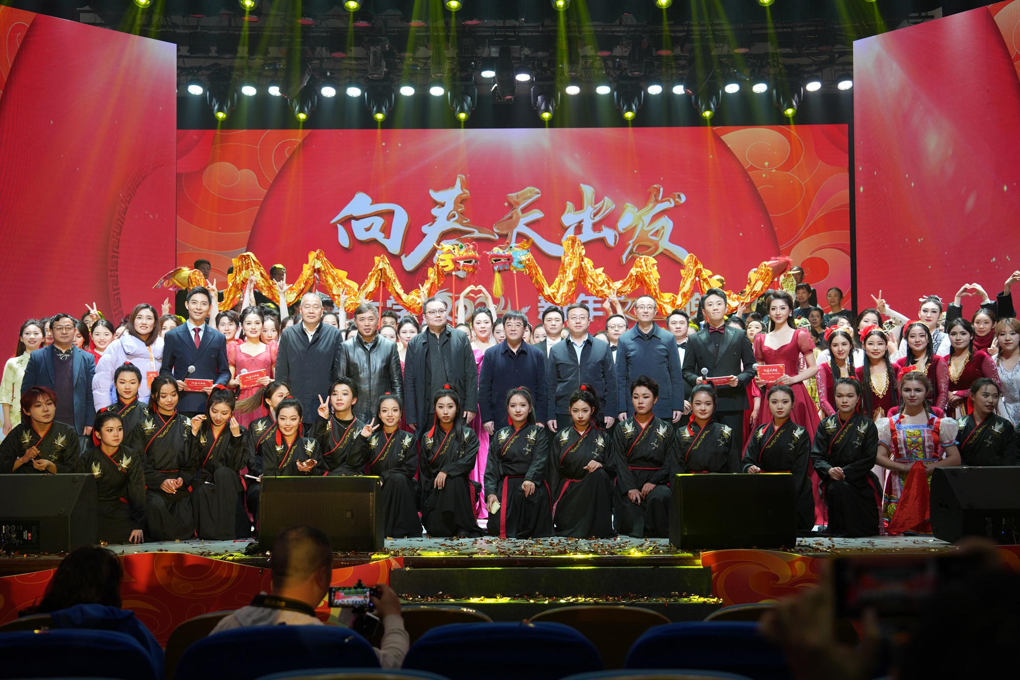 由新闻传媒学院带来的朗诵《向春天出发》开启了第四篇章“春之誓言”,学子们用青春之音述说着对春天的希冀,坚定地发出了“强国有我,请党放心”的铮铮誓言;音乐学院带来的歌曲《我的深情为你守候》《跟你走》激昂嘹亮,唱出了人们对祖国最深情地告白,吹响了“永远跟党走”的奋斗号角;来自“彩云之南”的校友们带来了合唱《我为共产主义把青春贡献》,彰显了代代beat365人将青春热血洒满祖国大地,把青春奋斗融入党和人民事业的忠诚担当;接过时代的接力棒,今天的beat365人自当踔厉奋发,勇毅前行,向春天出发、向梦想前进,与时代共振、与祖国同行,一曲合唱《我的祖国》将晚会气氛推向高潮。伴随着音乐《龙的传人》,晚会在师生们对新年的美好祝福中落下帷幕。