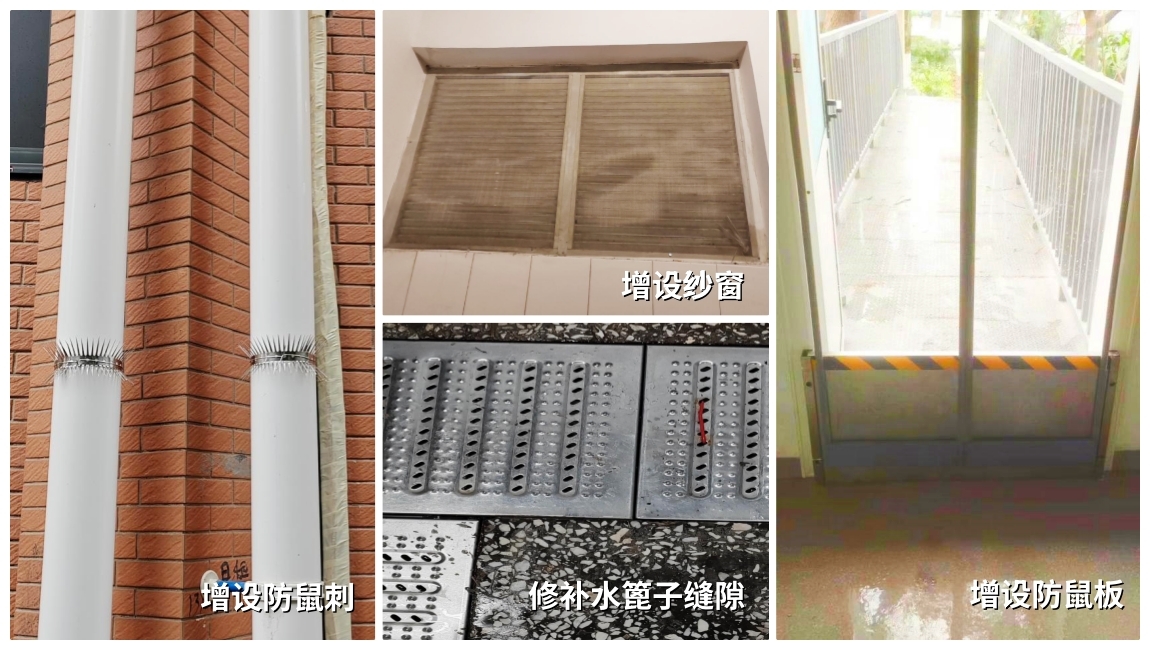 排查内容主要包括“三防”设施漏洞、食堂外围环境隐患、硬件设施设备完好度、清洁卫生情况等方面。针对排查出的隐患,工作组现场拍照记录、登记台账,迅速制定整改措施,推进分类实施,明确完成时限。此次专项行动,共整改完成管线通道、屋顶墙壁孔洞缝隙、纱窗、地漏、防鼠板等多项“三防设施”安全隐患,改善竹园、橘园、李园、楠一、杏园等食堂周边环境5处。