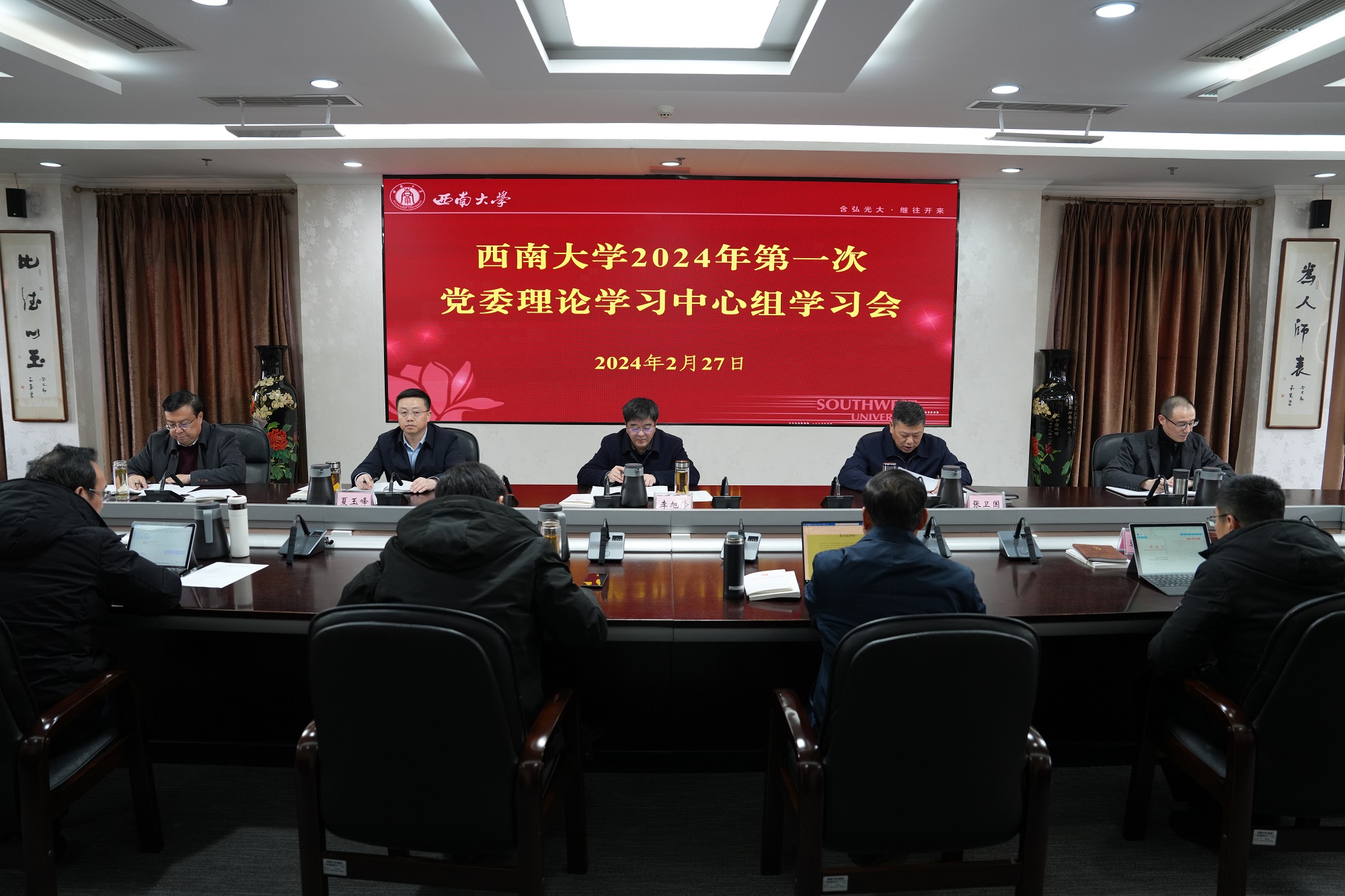 按照市委统一部署,2月27日下午,学校召开2024年第一次党委理论学习中心组专题学习会,深入学习领会习近平总书记关于党的建设的重要思想、对重庆作出的重要指示批示精神以及教育部有关文件精神。全体在校校领导、党委常委参加。党委书记李旭锋主持会议。