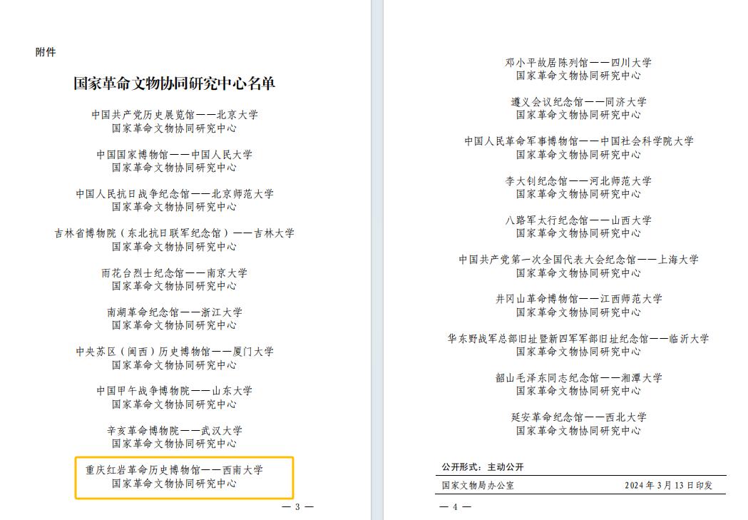 近日,教育部、国家文物局公布了国家革命文物协同研究中心名单,学校协同重庆红岩革命历史博物馆红岩博物馆创建的“重庆红岩革命历史博物馆——beat365英国官网国家革命文物协同研究中心”(以下简称“协同研究中心”)成功入选。协同研究中心是由教育部、国家文物局批准设立的国家级人文社科重点研究平台,按照教育部人文社会科学重点研究基地管理。这是继西南民族教育与心理研究中心之后,学校获批的第二个教育部人文社科重点研究基地。