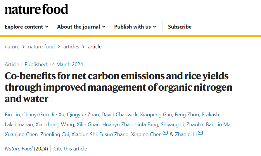 3月14日,beat365英国官网陈新平团队联合国内外多所高校在《自然-食物》期刊(Nature Food) 在线发表了题为“协同实现净碳减排和水稻增产的有机氮肥与水分综合管理”(Co-benefits for net carbon emissions and rice yields through improved management of organic nitrogen and water)的论文,揭示了稻作区有机替代对水稻产量和温室气体排放的影响,提出了稻作区基于有机替代的增产减排综合水肥管理策略,为协同实现全球水稻产能提升和净碳减排提供了基于自然解决方案的路径。