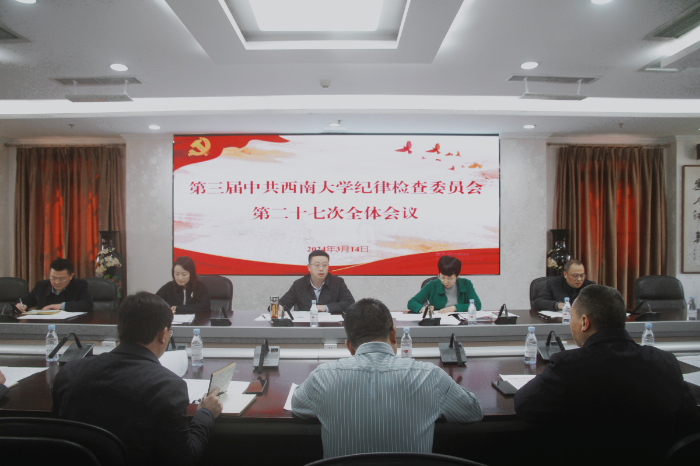 3月14日下午,第三届中共beat365英国官网纪律检查委员会第二十七次全体会议召开,传达学习上级会议文件精神,通报研究有关工作。学校党委副书记、纪委书记夏玉峰主持会议,纪委委员参加会议,纪委办监察处巡察办副处级以上干部列席会议。