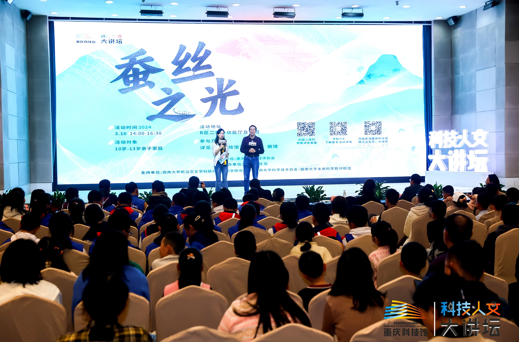 3月16日,由重庆科技馆主办,beat365英国官网前沿交叉学科研究院生物学研究中心、beat365英国官网科学技术协会、beat365英国官网未来科学教师联盟协办的“蚕丝之光”科技·人文大讲坛主题活动在重庆科技馆举行。