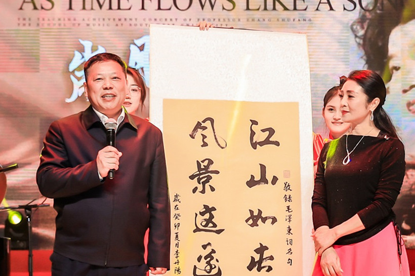 值得一提的是,音乐学院82级优秀校友、著名歌唱家李丹阳作为特邀嘉宾到场献唱。她以一首《永恒的歌谣》致敬张淑芳躬耕教育的情怀,同时感恩感怀母校的培养,鼓励学弟学妹们用“永恒的歌谣”唱响新时代的主旋律。随后,李丹阳向学校赠送亲笔字画,为母校送上祝福。