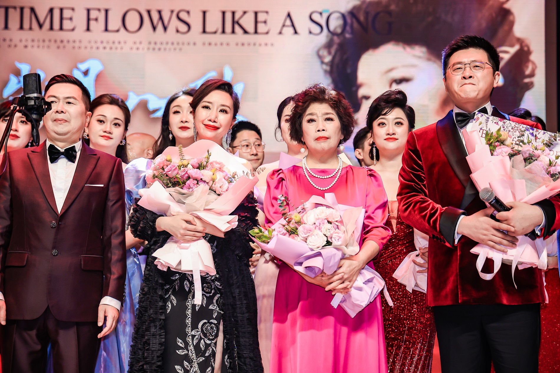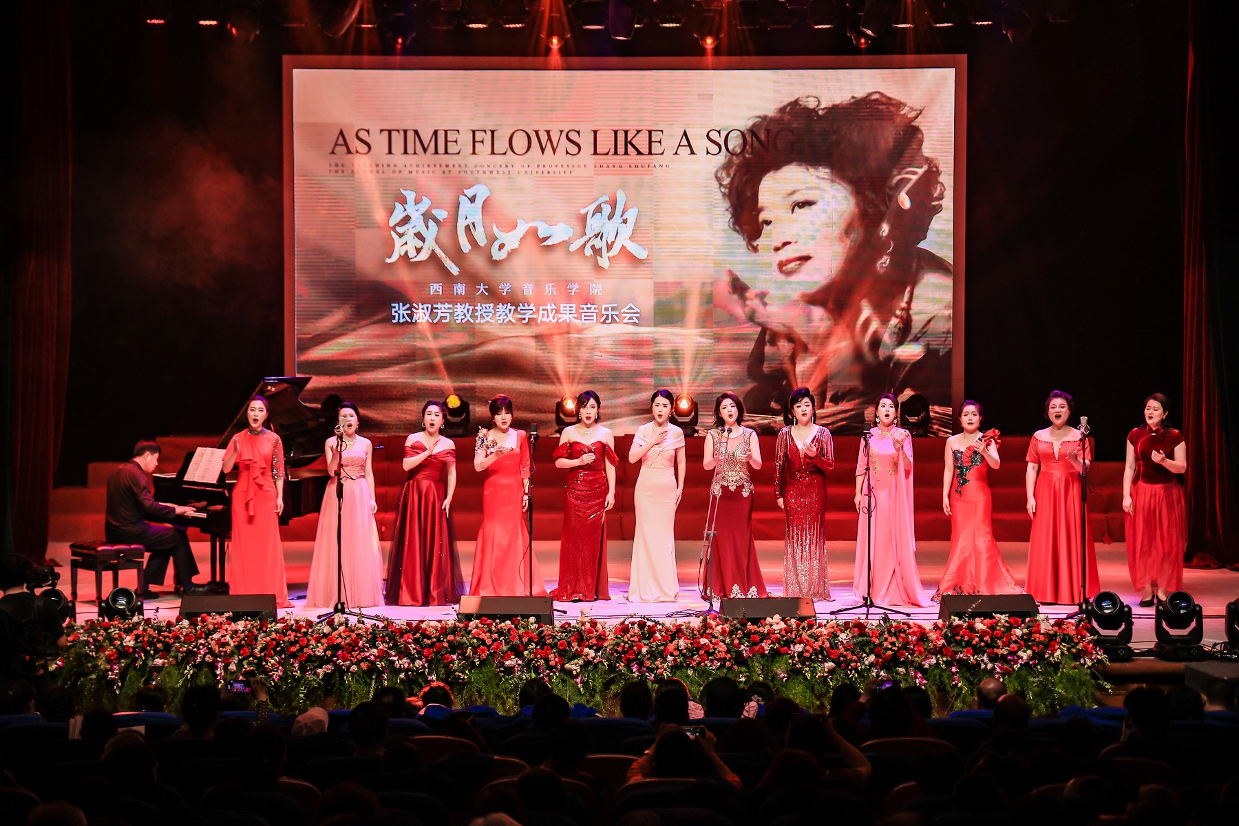 “岁月长河,人生如歌,似水光阴,往昔如火”,张淑芳历届学生代表用一首深情的《岁月如歌》,拉开了音乐会的序幕。多年不见的校友们登台献唱,曲音悠长连绵,歌词娓娓道来,仿佛回到了美好的求学时光,现场掌声雷动。