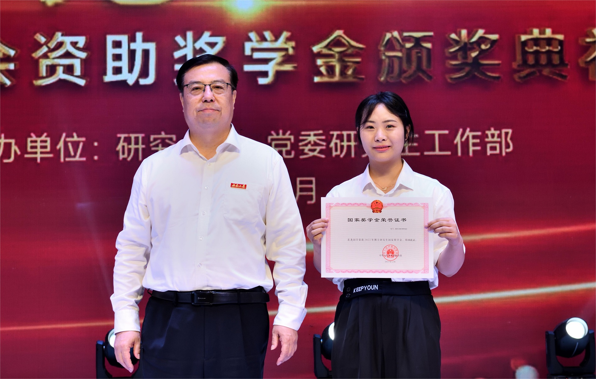 在典礼上,黄杰宣读了研究生国家奖学金表彰决定。学校共有35名博士研究生、174名硕士研究生获2023年度研究生国家奖学金。