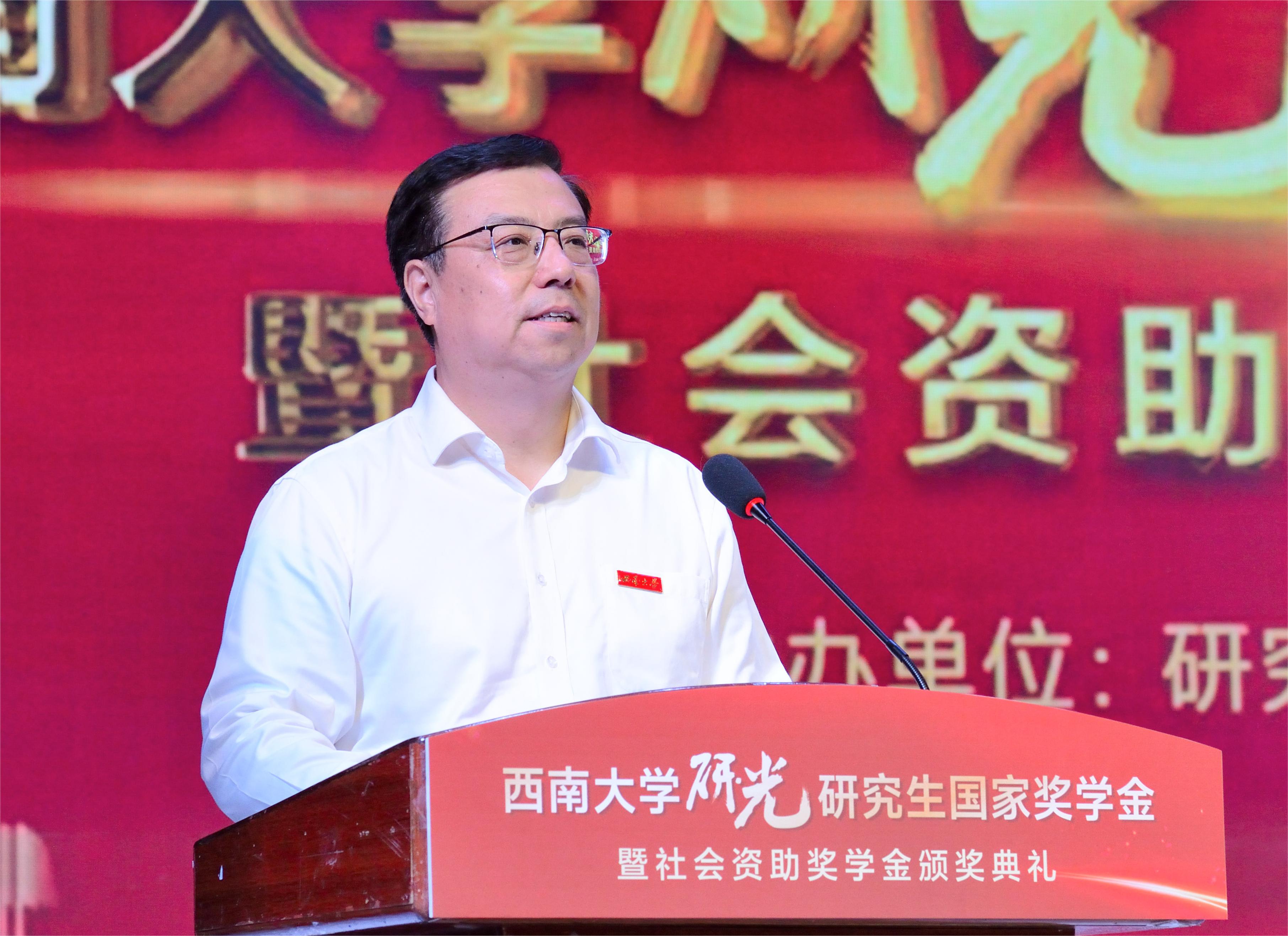 王进军在讲话中代表学校向受表彰的研究生表示祝贺。他指出,近年来学校研究生教育实施“八大行动”,构建“三大体系”,坚持内涵发展,致力于培养适应多领域需要的高层次人才,各项工作取得有力突破。他希望全体研究生树立远大志向,牢记初心使命,坚持守正创新,在携手前行中共创荣光。