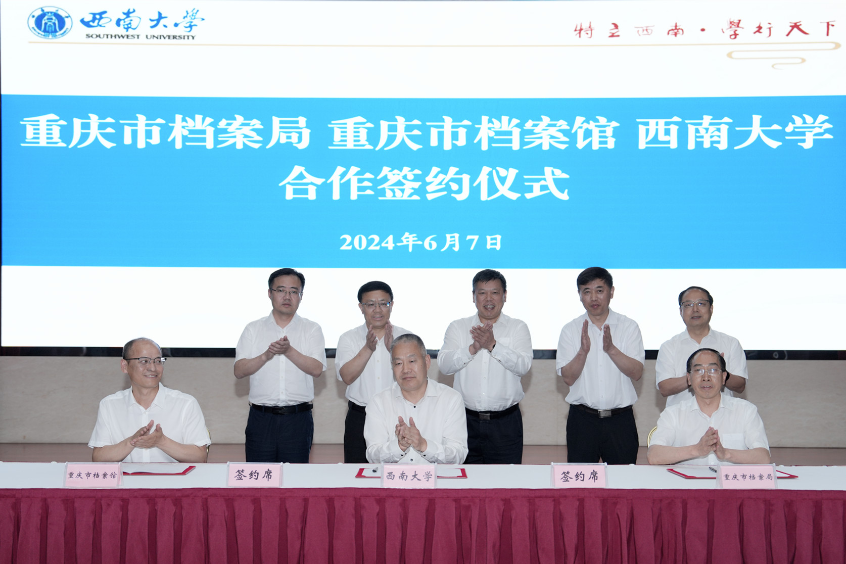 6月7日,重庆市档案局、重庆市档案馆、beat365英国官网合作签约仪式暨交流座谈会在beat365英国官网举行。市委办公厅副主任、市档案局局长李维,市档案馆馆长李小平,市档案馆二级巡视员刘泽利,学校党委书记张卫国,党委副书记潘洵,副校长周光明、葛信勇出席签约仪式。仪式由周光明主持,三方代表在会上签署了合作框架协议。