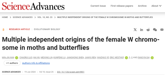 6月19日,国际著名期刊《科学进展》(Science Advances)(《科学》杂志综合性子刊)在线发表了资源昆虫高效养殖与利用全国重点实验室代方银教授团队的研究论文“蛾类和蝶类昆虫雌性W染色体的多重独立起源”(Multiple independent origins of the female W chromosome in moths and butterflies)。该研究首次获得了家蚕W染色体完整基因组序列,并揭示鳞翅目昆虫W染色体起源与进化的新机制。研究结果不仅在基因组与进化生物学领域具有重要理论意义,而且在家蚕等鳞翅目昆虫的性别调控的研究方面具有重大价值,并为家蚕分子育种带来新的前景。