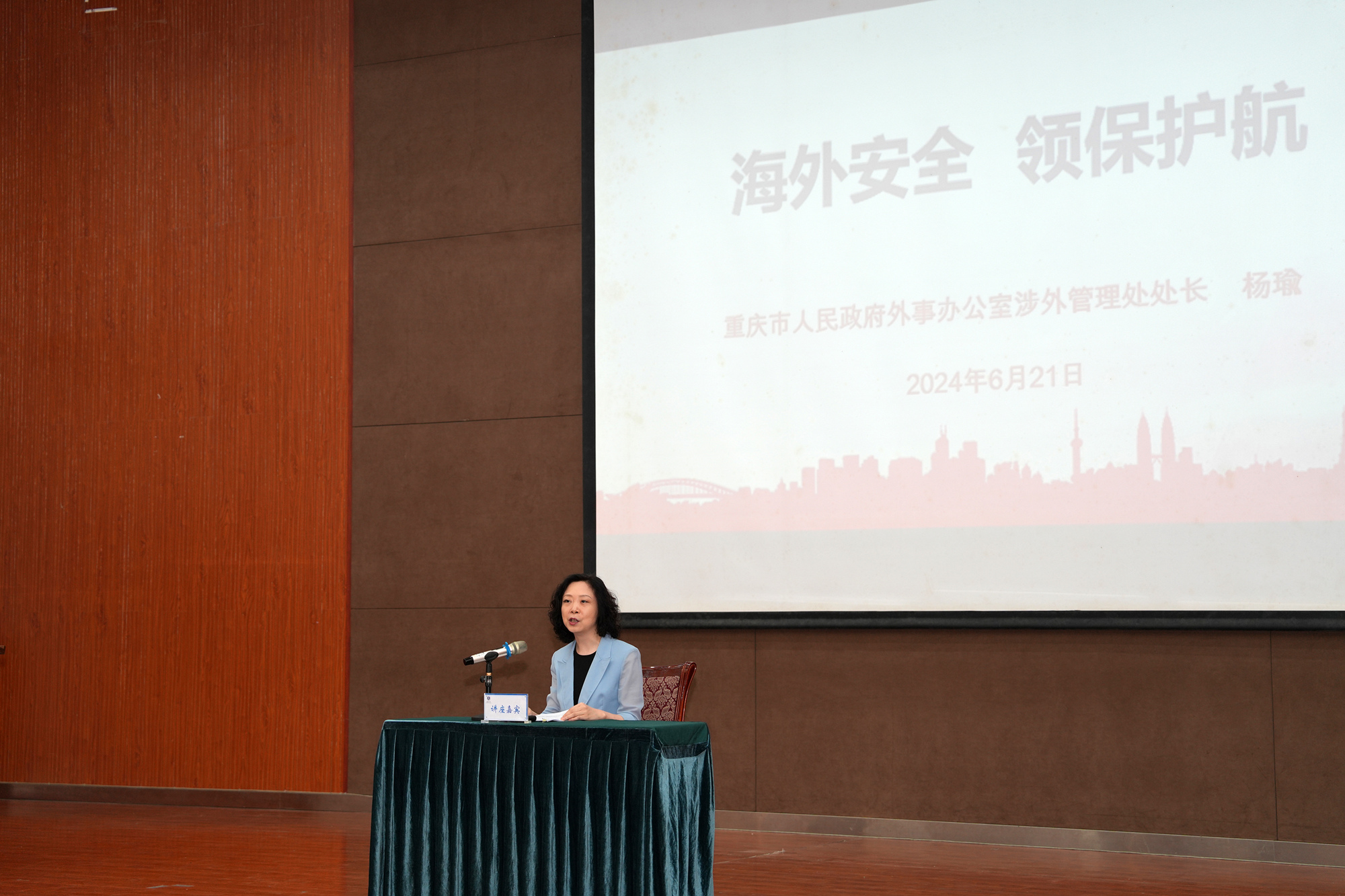 重庆市人民政府外事办公室涉外管理处处长杨瑜作“领事保护与海外安全”主题报告,结合丰富的工作经验和实际案例,向师生们普及领事保护知识,指导师生防范相关风险。